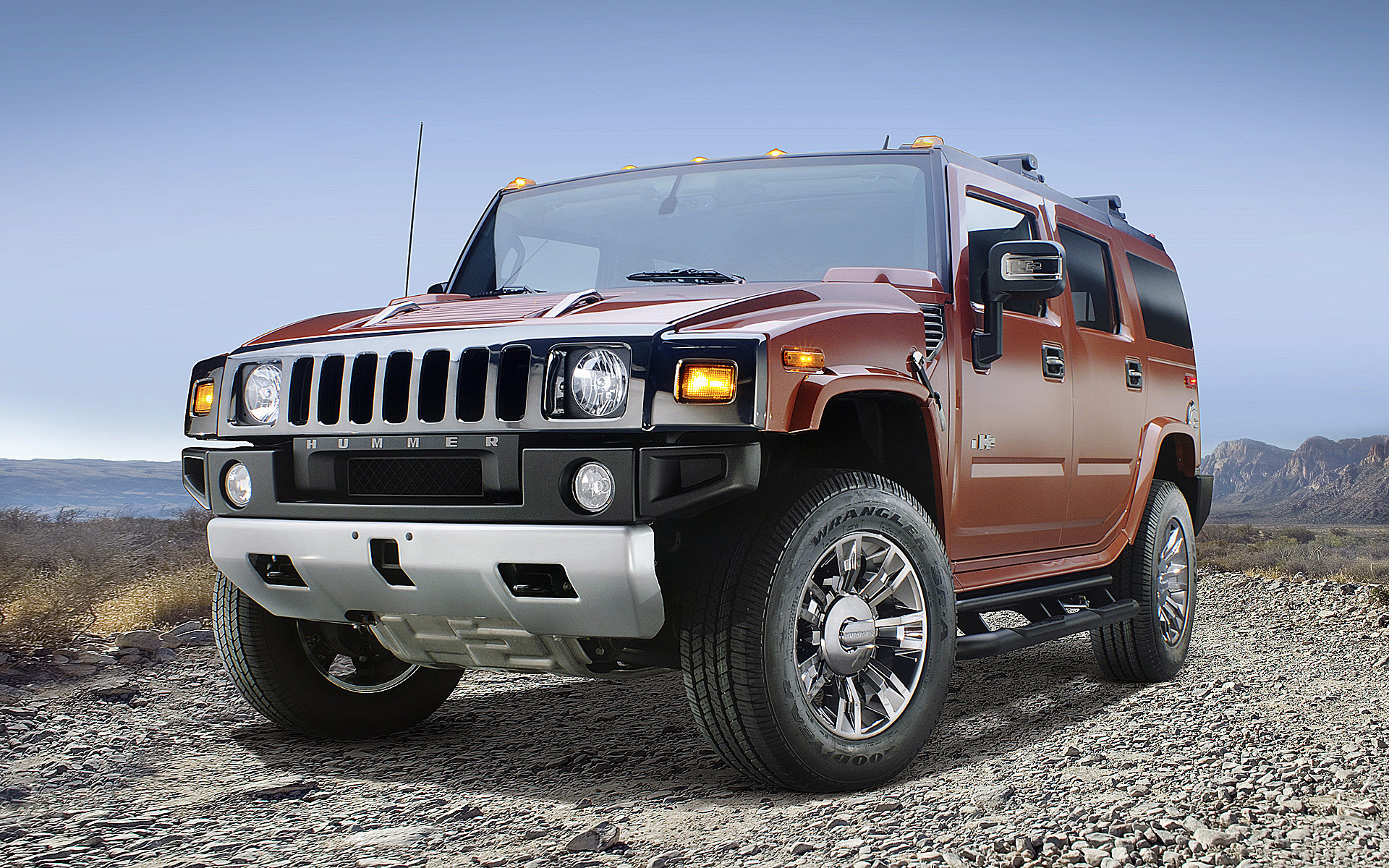 Description: A red hummer truck parked on a rocky road in the desert with mountains in the background and a blue sky.