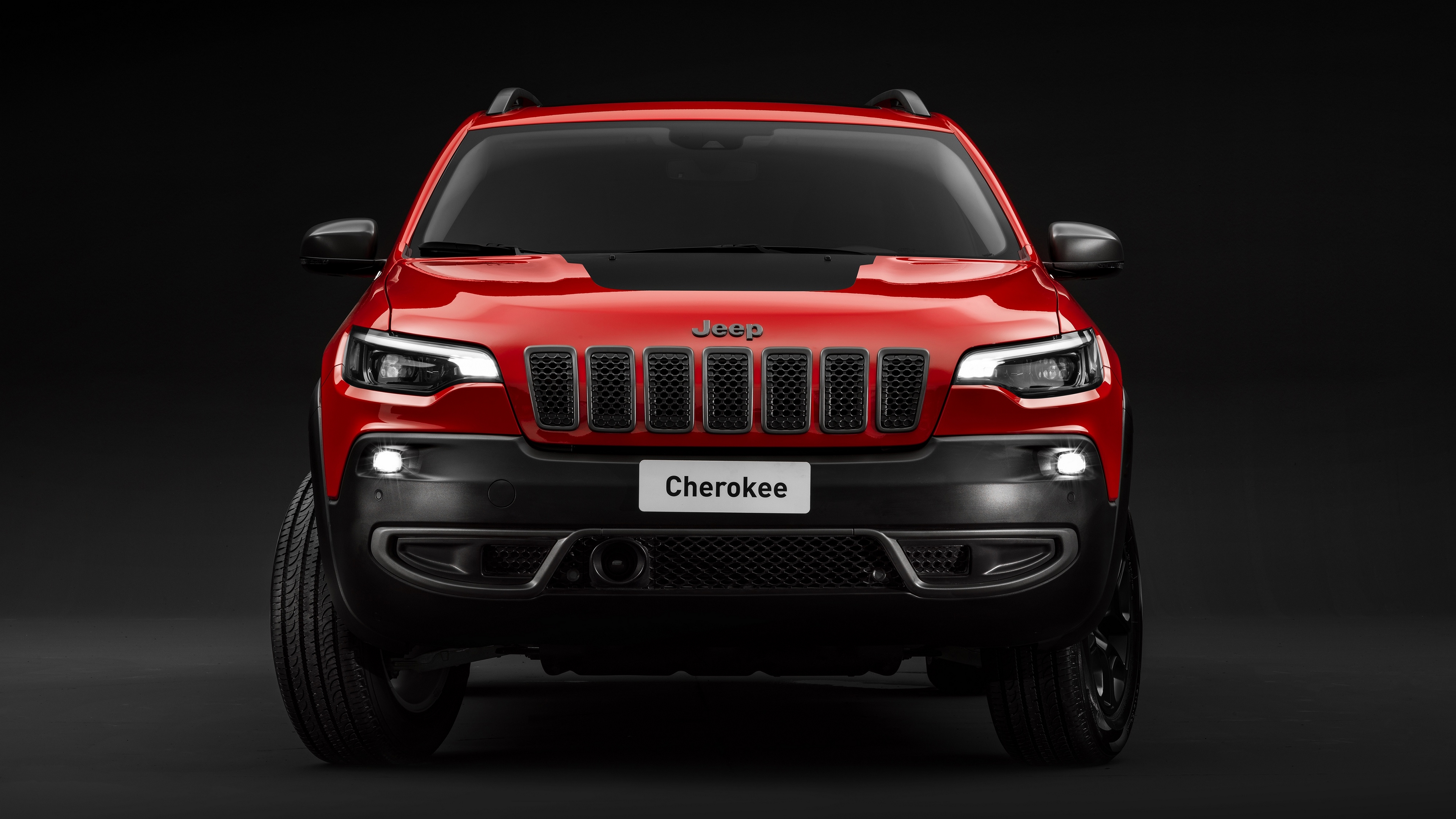Description: A red jeep is shown in a dark room with a black background and a black background with a white jeep.