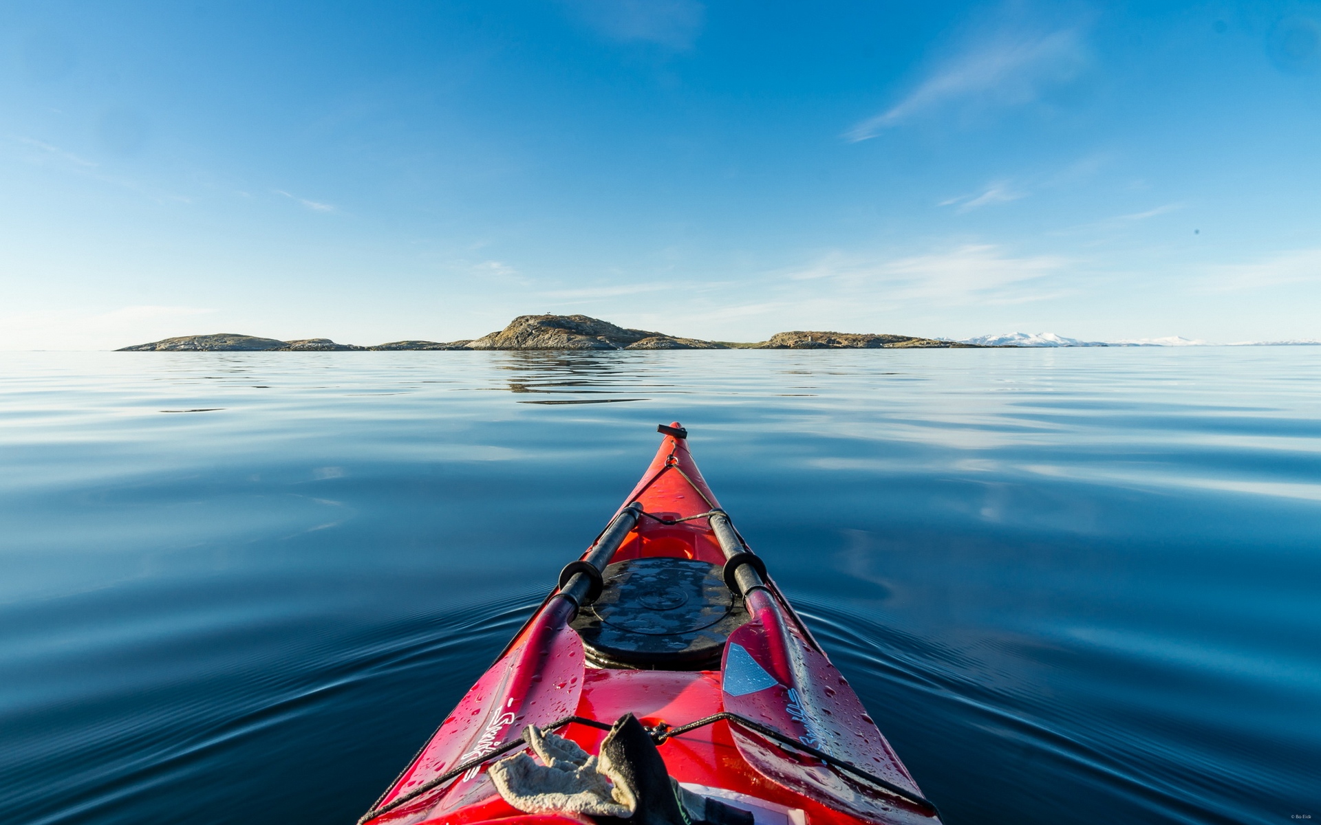 Description: A red kayak is in the middle of the water with a small island in the distance in the distance.