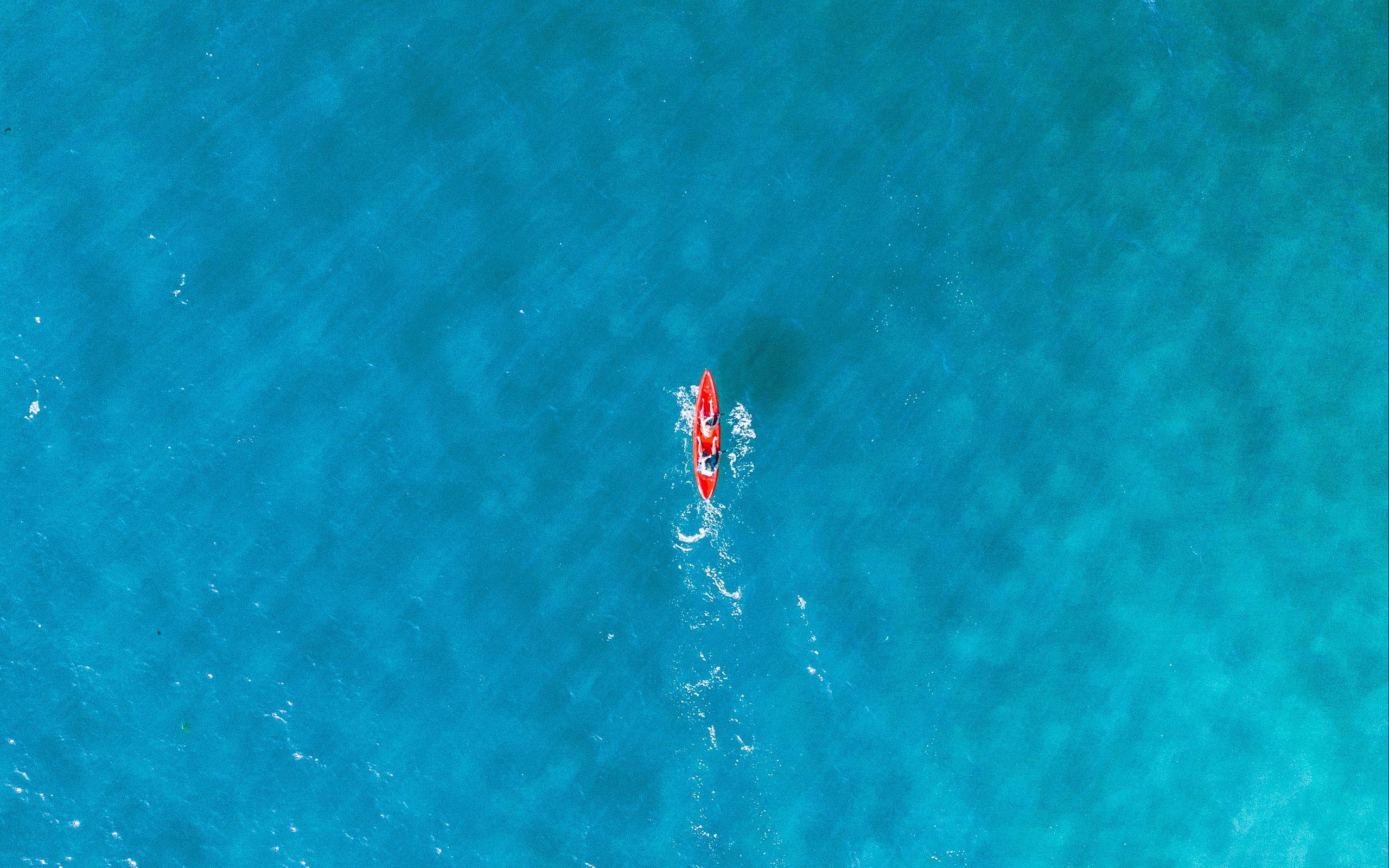 Description: A person in a red kayak in the middle of the ocean with a red paddle boat in the background.