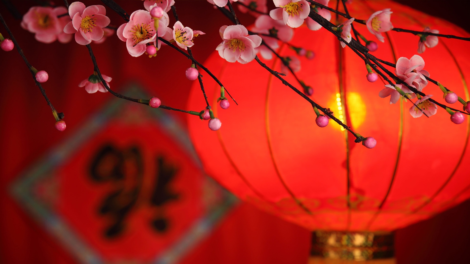 Description: A red lantern with pink flowers on it and a red background with a chinese symbol in the background and a red lantern with a red background with a red light.