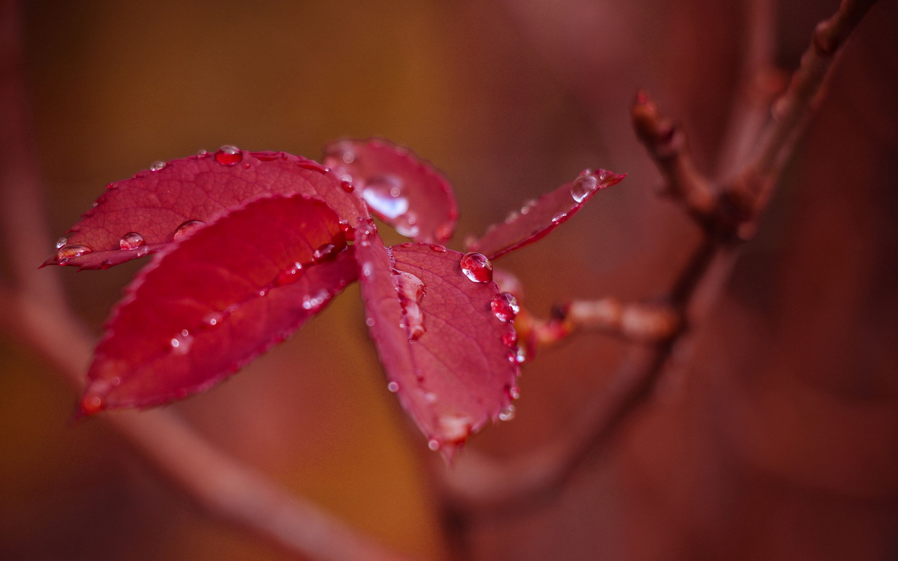 Description: A red leaf with water droplets on it's leaves and a branch with a few buds on it.
