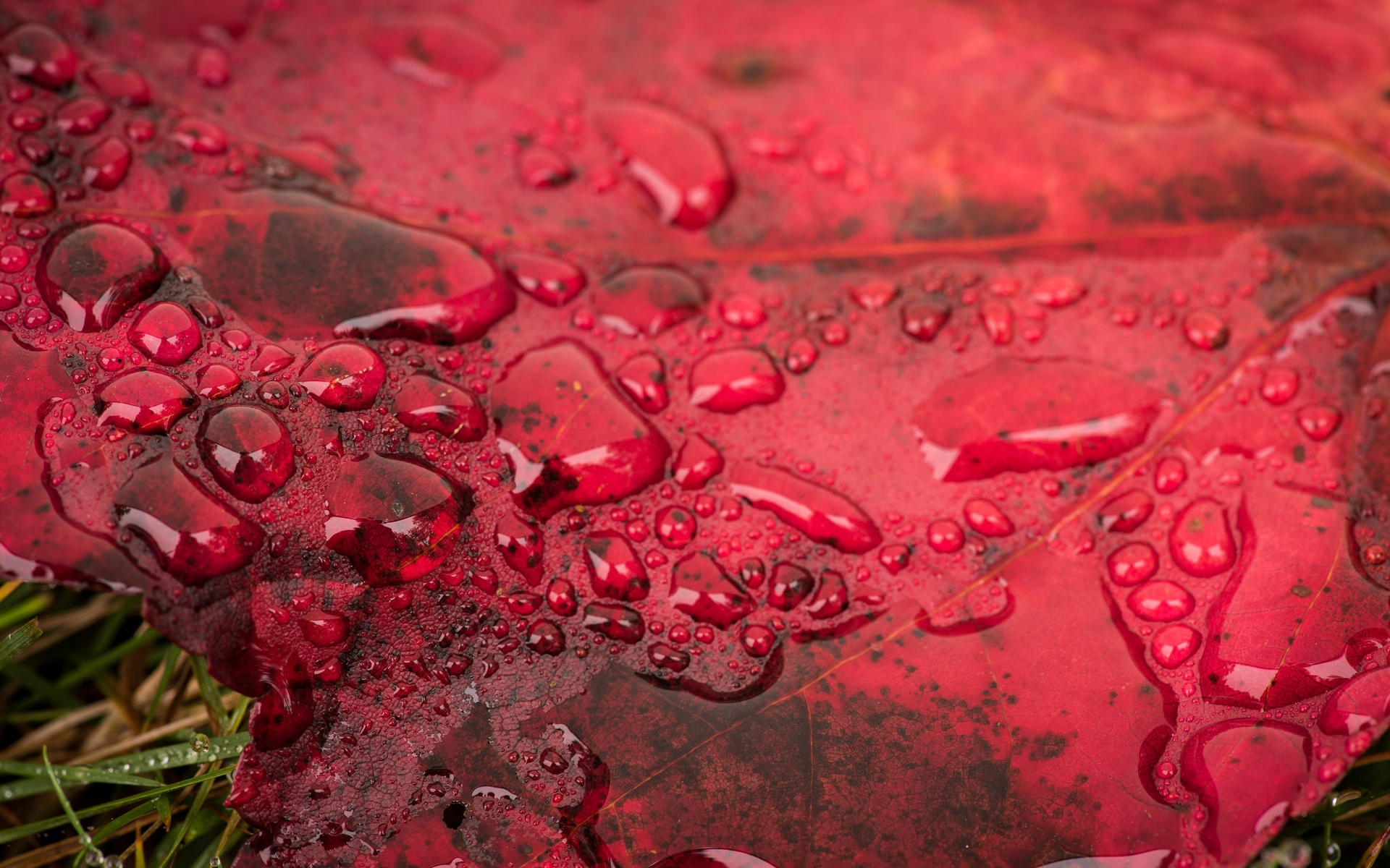 Description: A red leaf with water drops on it in the grass with green grass and weeds in the background.