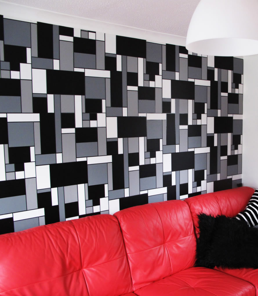 Description: A red leather couch sitting in front of a black and white wallpapered wall with a black and white pillow.