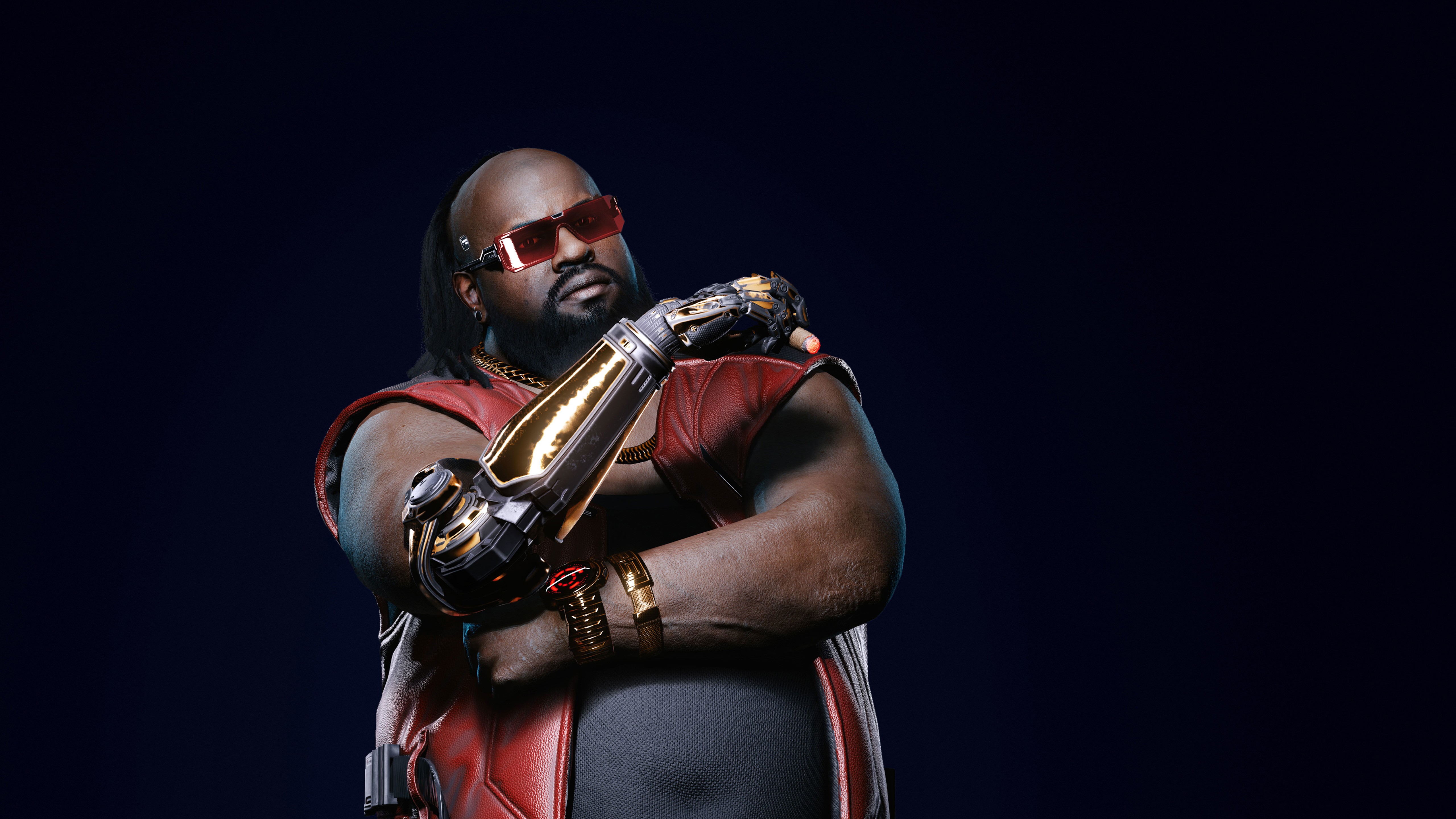 Description: A man in a red leather outfit holding a gold object in his hands and wearing sunglasses on his head.