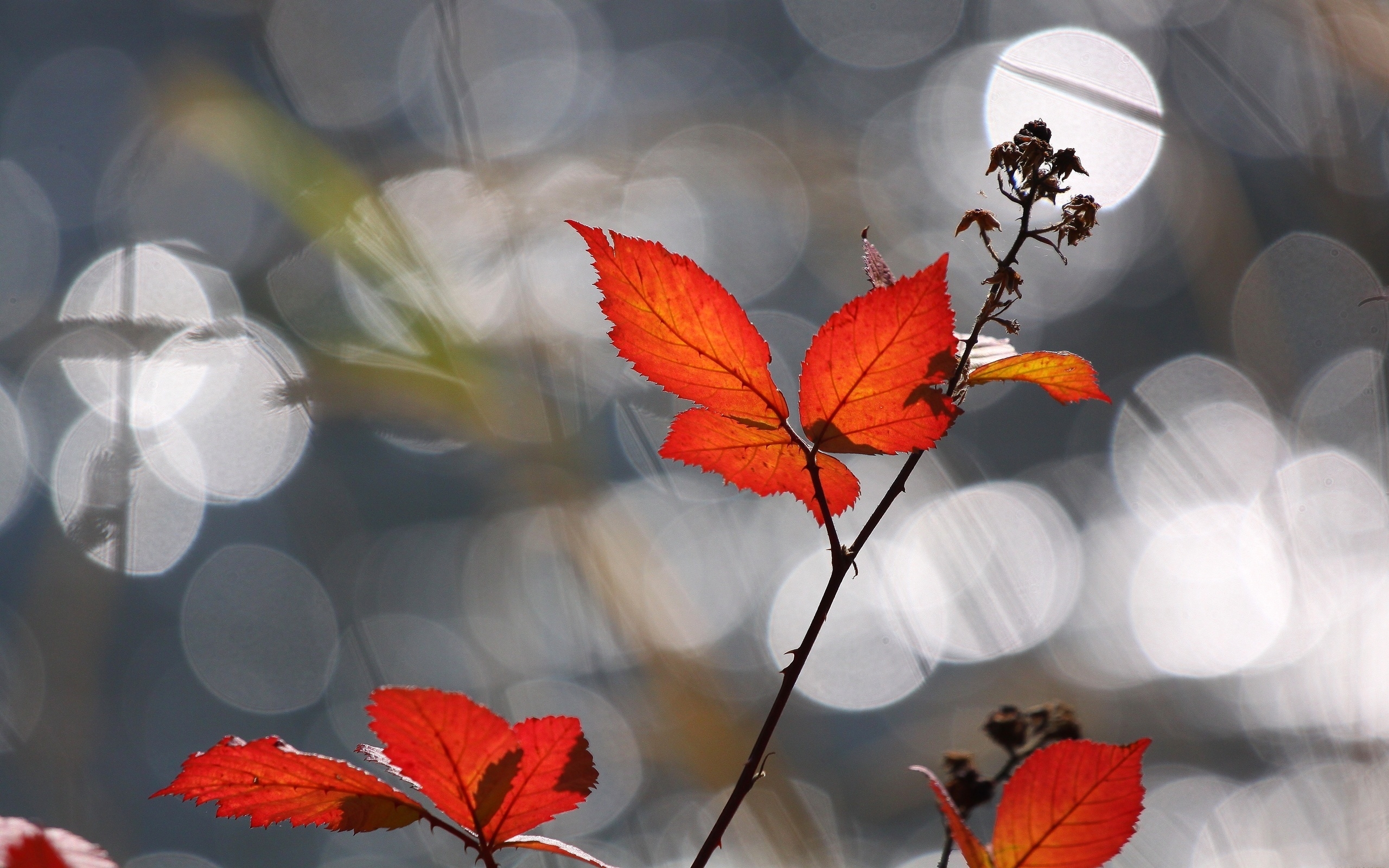 Description: A branch with red leaves in front of a blurry background of light and water droplets on the surface.