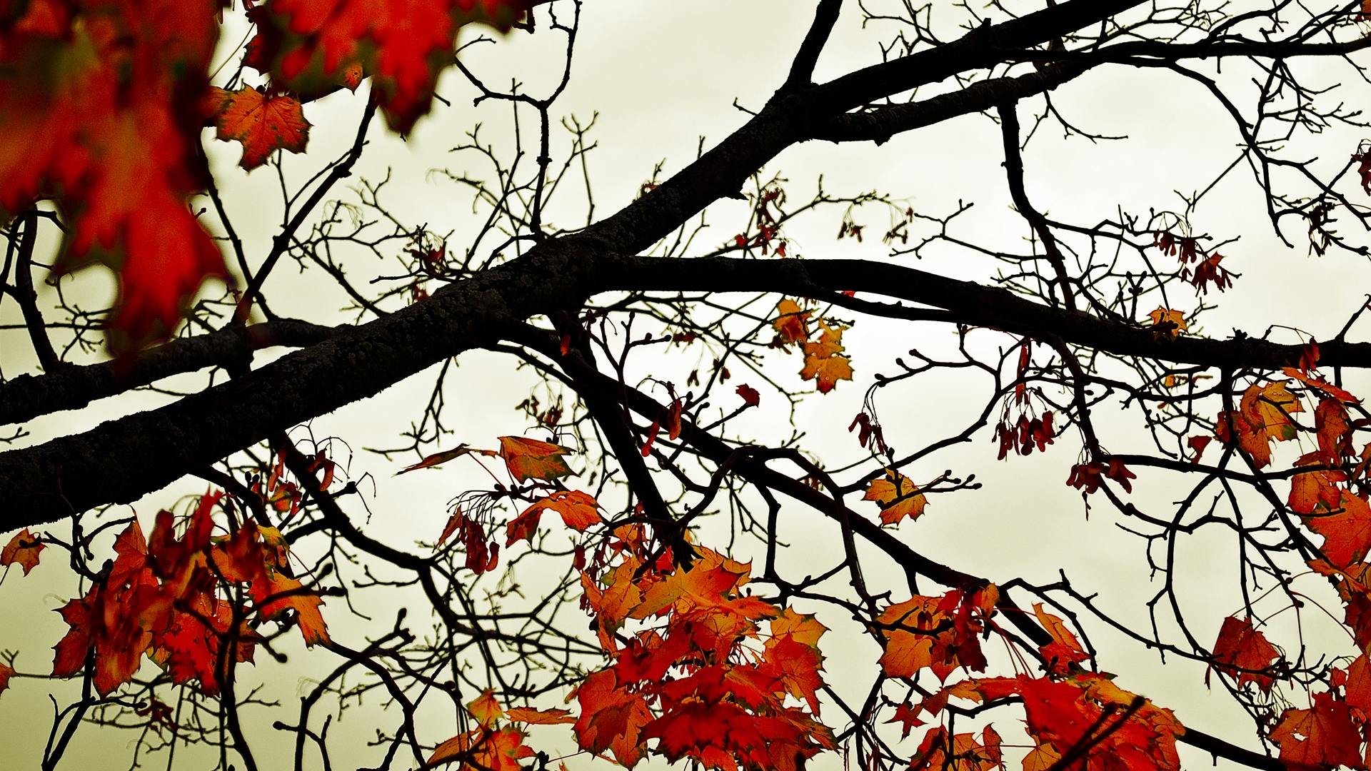 Description: A tree with red leaves and a cloudy sky in the background with a few clouds in the sky behind it.