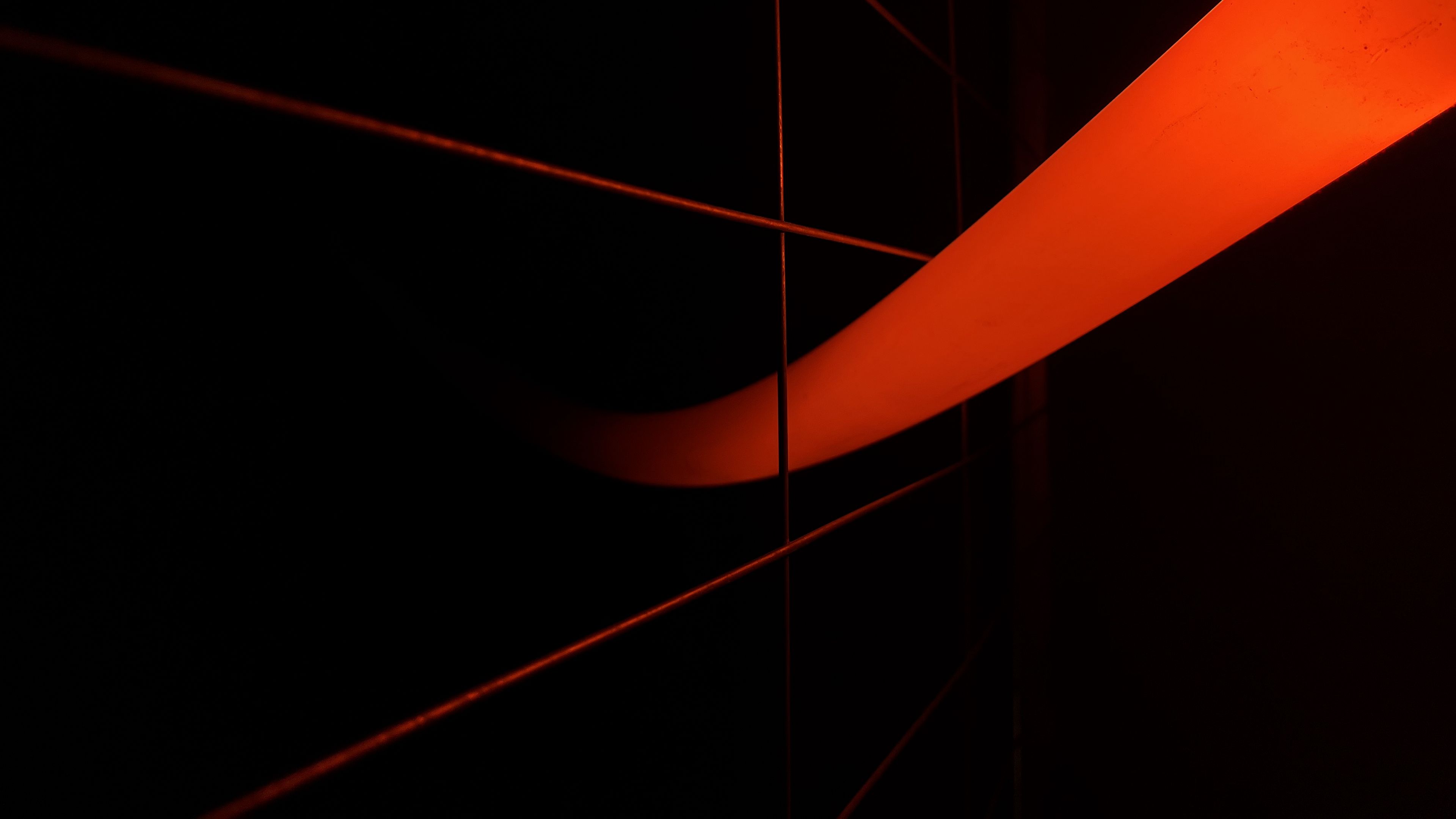 Description: A red light shining on a black wall with a long tube in the corner of the room next to it.