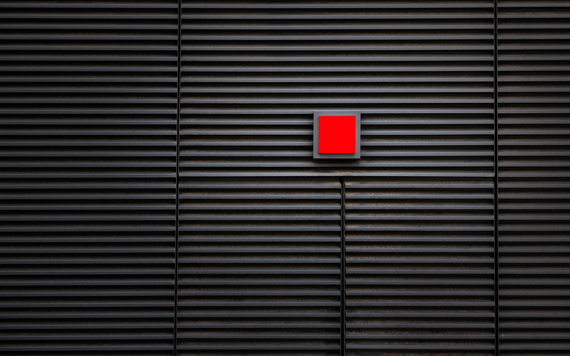 Description: A red light switch on a black wall with vertical blinds on it's sides and a red light switch on the wall.