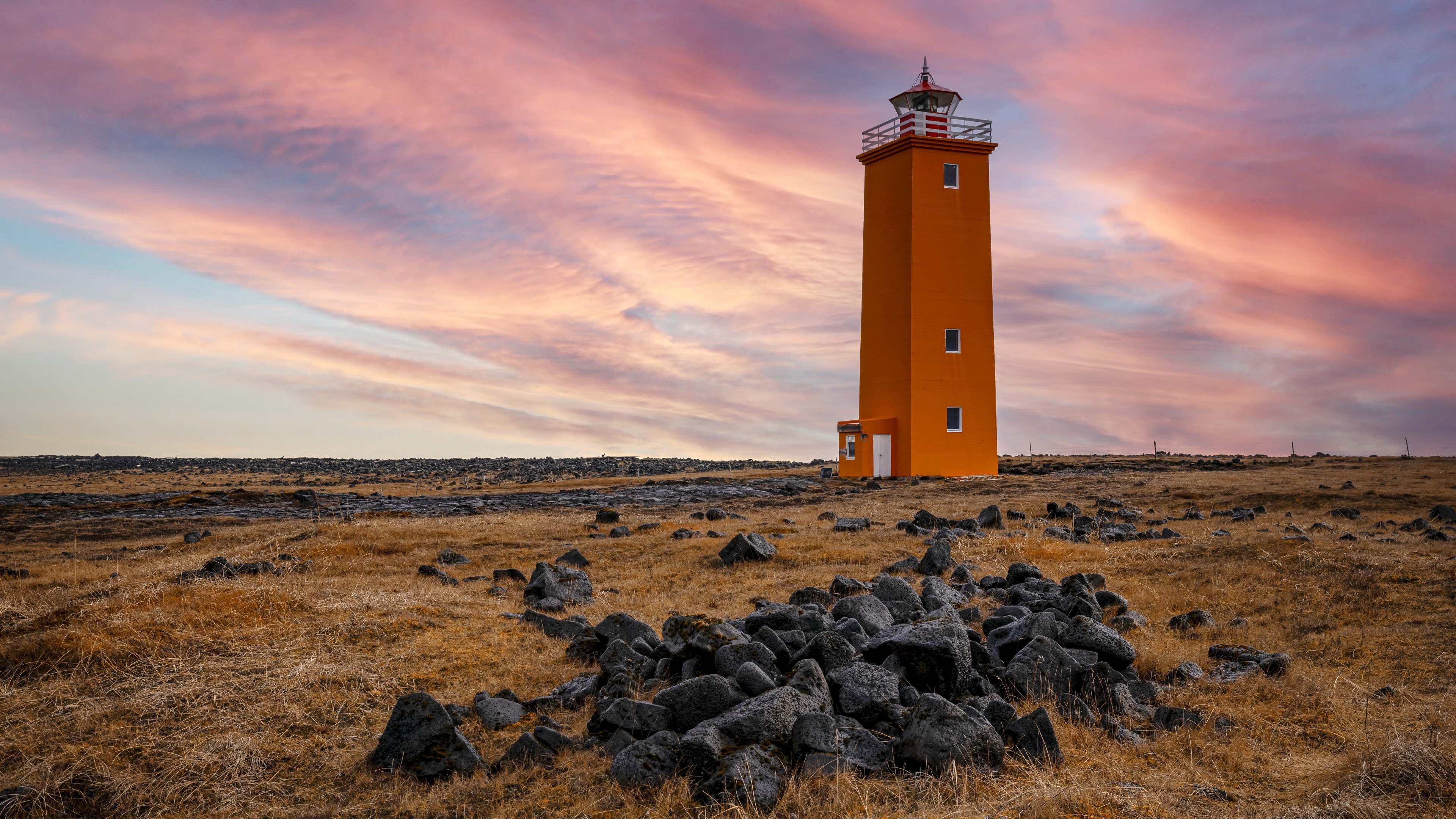 Description: A red light house sitting on top of a dry grass field next to a pile of rocks and a pile of rocks.