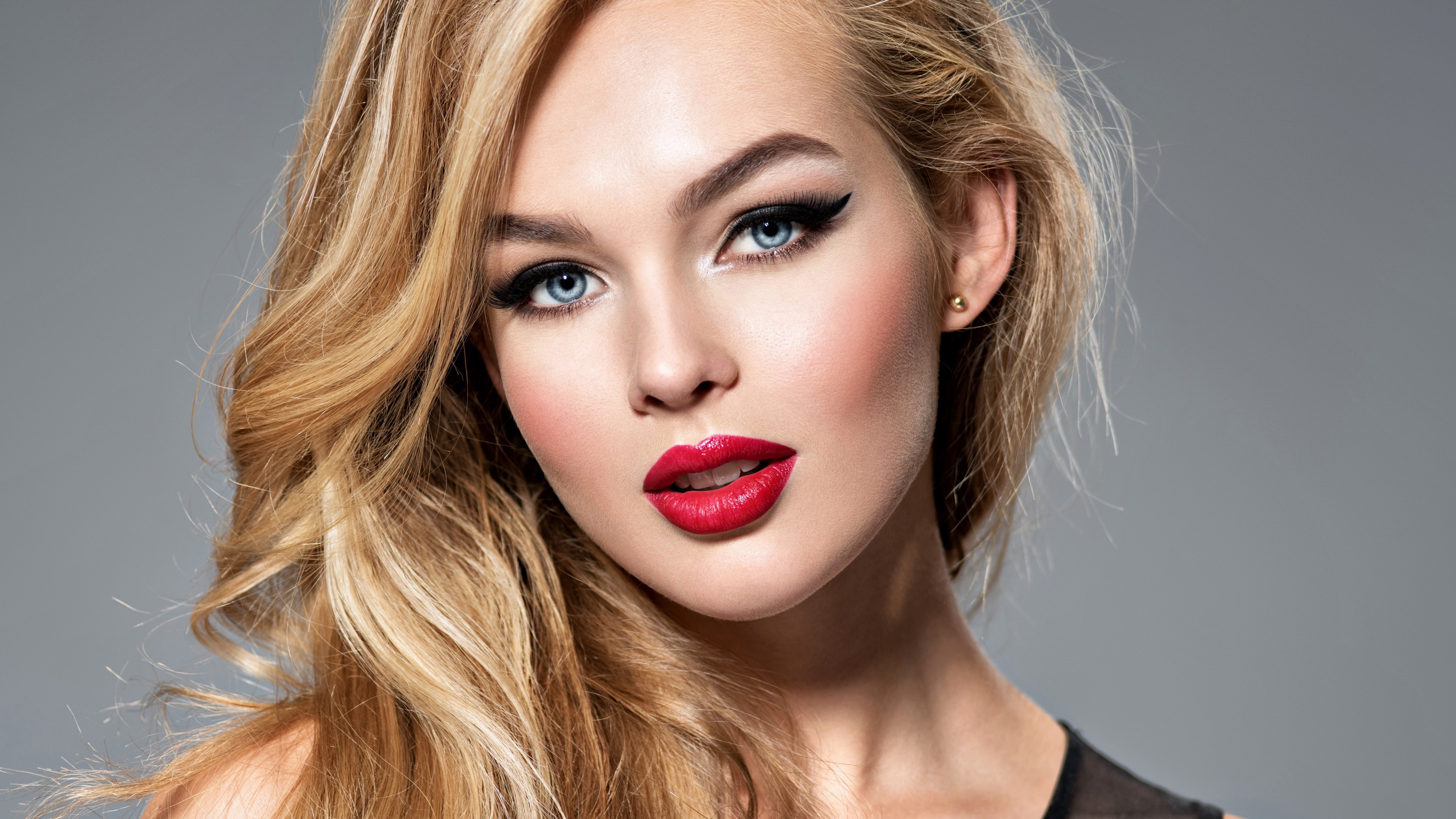 Description: A woman with red lipstick and a black dress on a gray background with a red lip and a black dress.