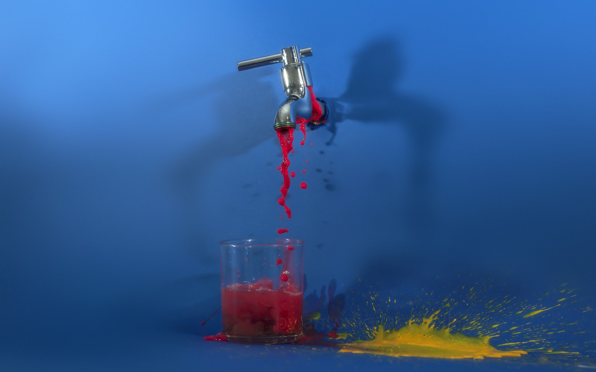 Description: A red liquid is pouring into a glass of liquid from a faucet on a blue background with a yellow substance.