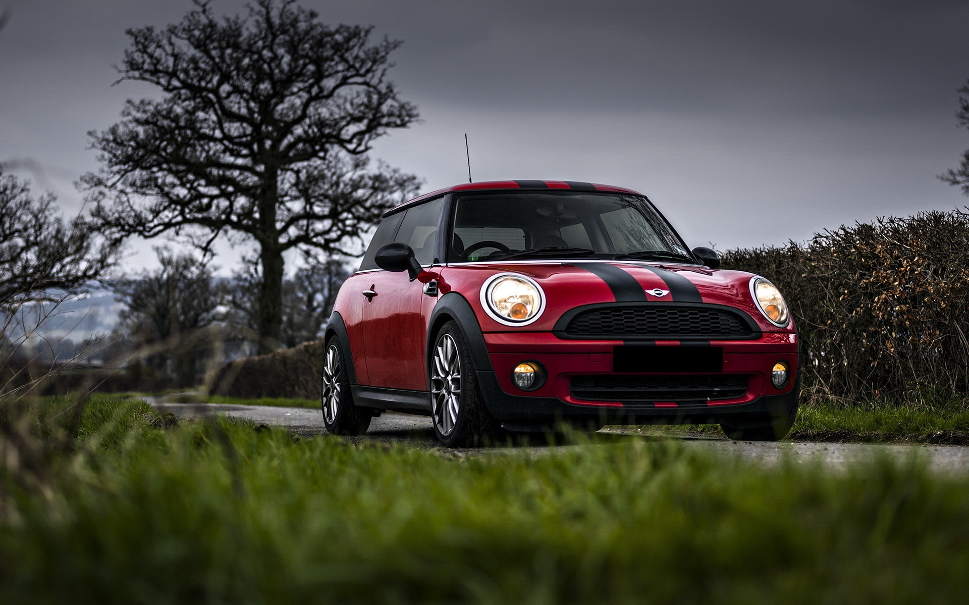Description: A red mini cooper parked on a road next to a tree and bushes with a dark sky in the background.
