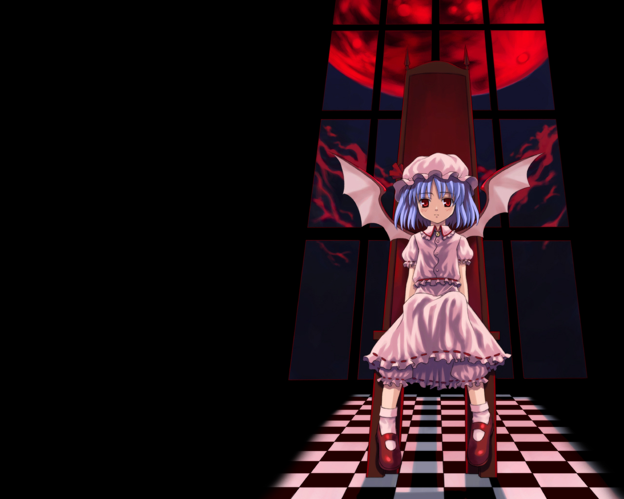 Description: A girl in a dress standing in front of a window with a red moon behind her and a black and white checkered floor.