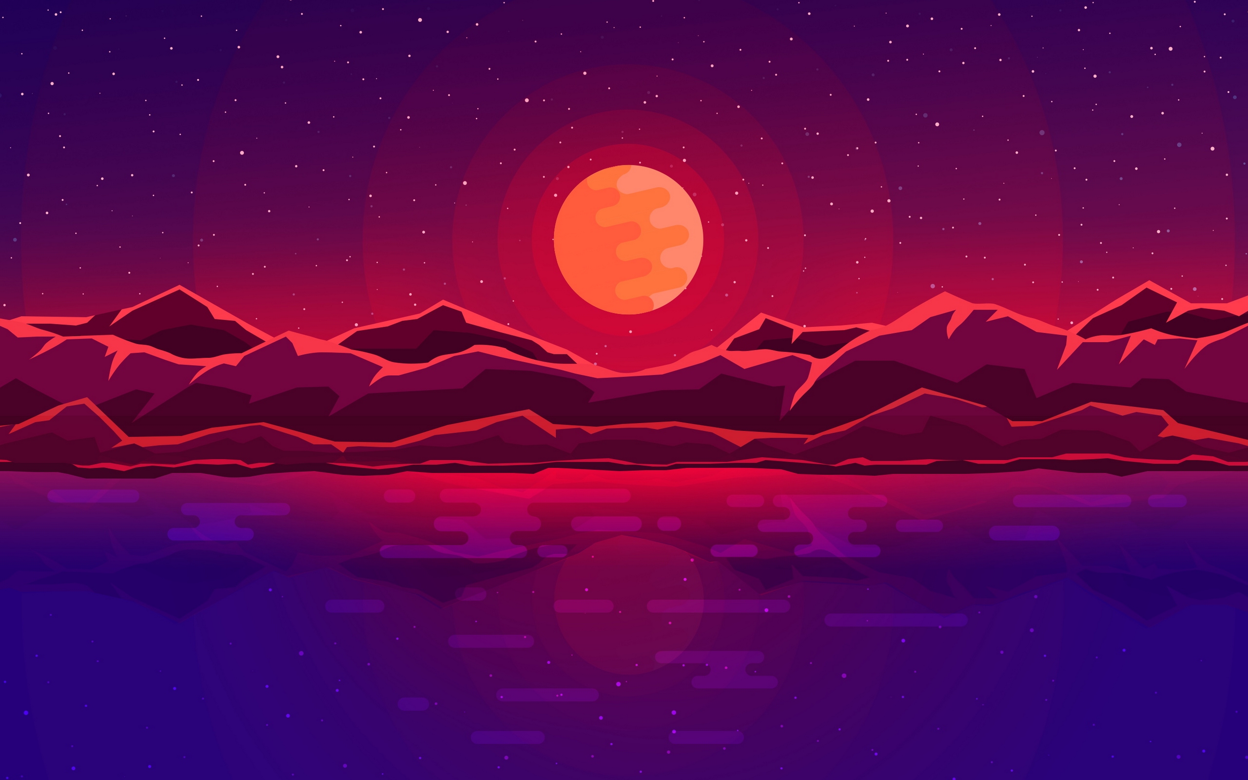 Description: A red moon over a mountain range with a lake below it and a red moon in the sky above.