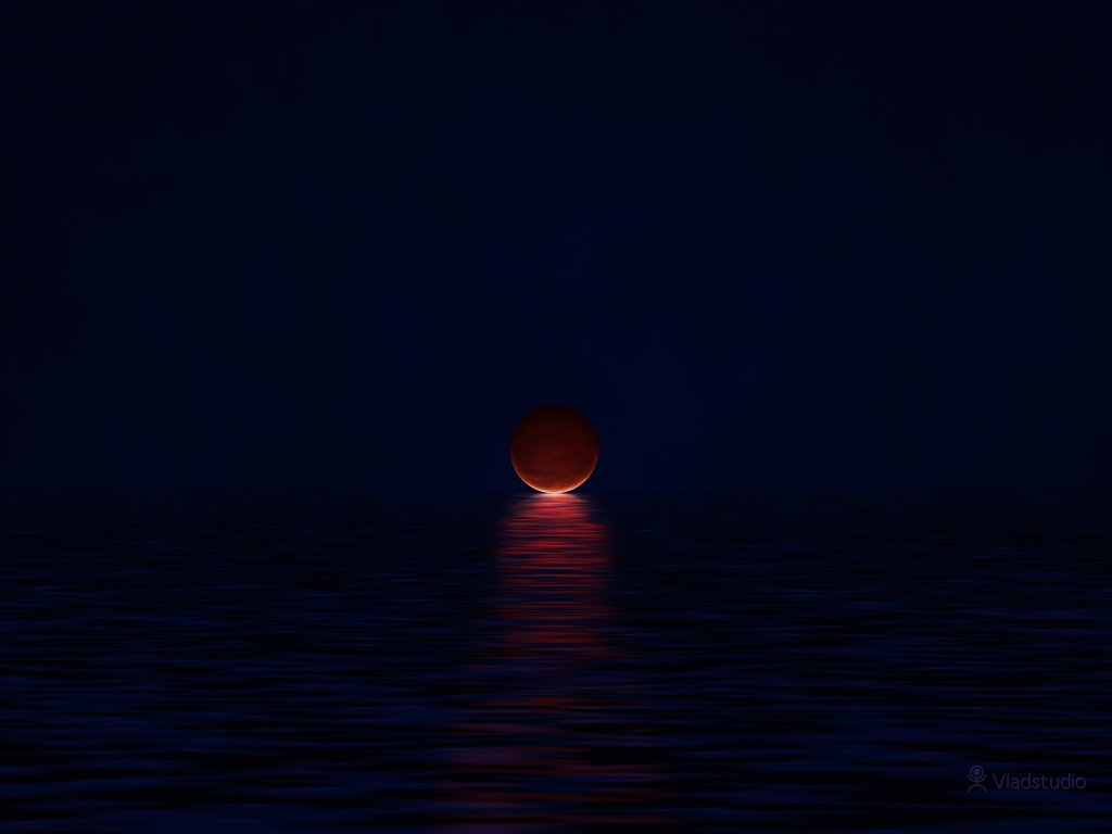Description: A red moon is seen over the water at night time with a dark sky background and a bright red light reflecting off the water.