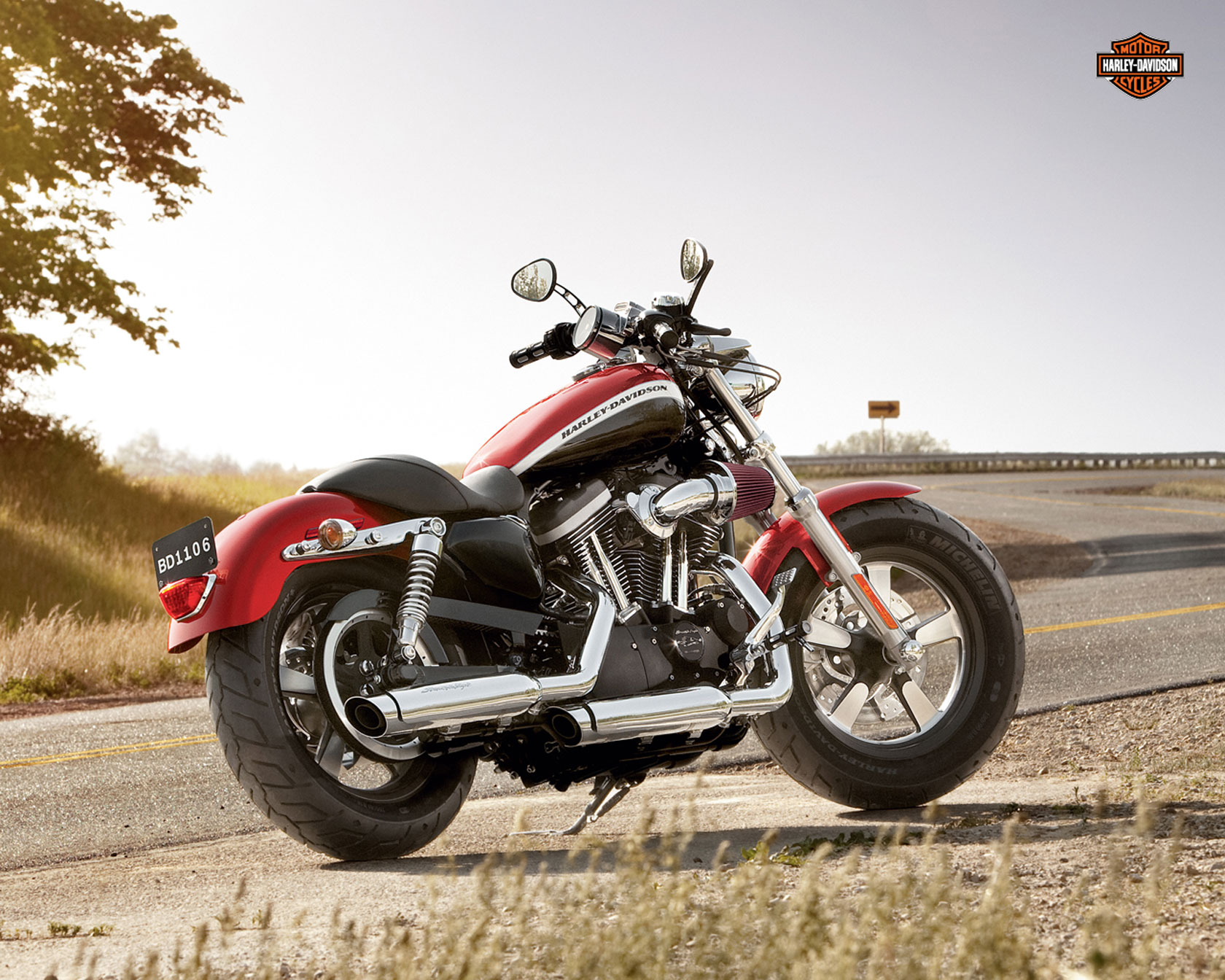Description: A red motorcycle parked on the side of a road next to a tree and grass field with a sky background.