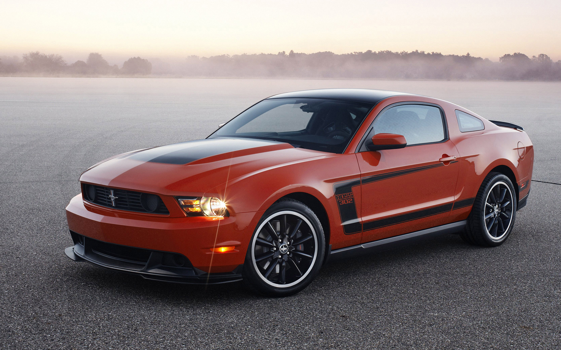 Description: A red mustang mustang parked in a parking lot with fog in the background and trees in the distance.