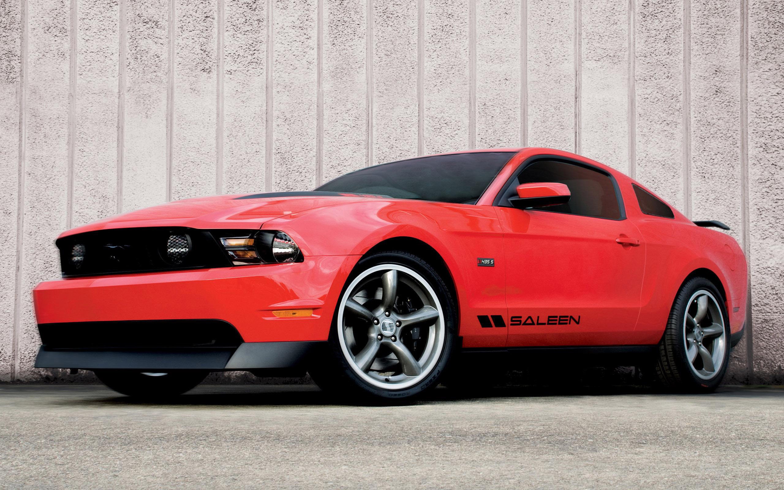 Description: A red mustang parked in front of a wall with a white wall behind it and a black rim on the front.