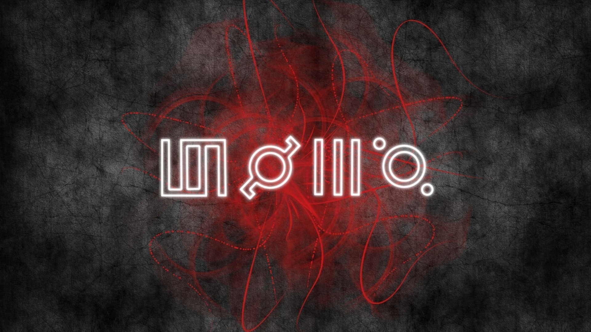 Description: A red neon sign that reads om in a dark background with a swirly pattern of red and white.