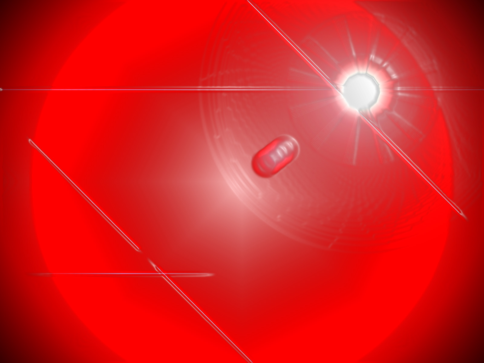 Description: A red object with a white light in the middle of it and a black background with lines around it.
