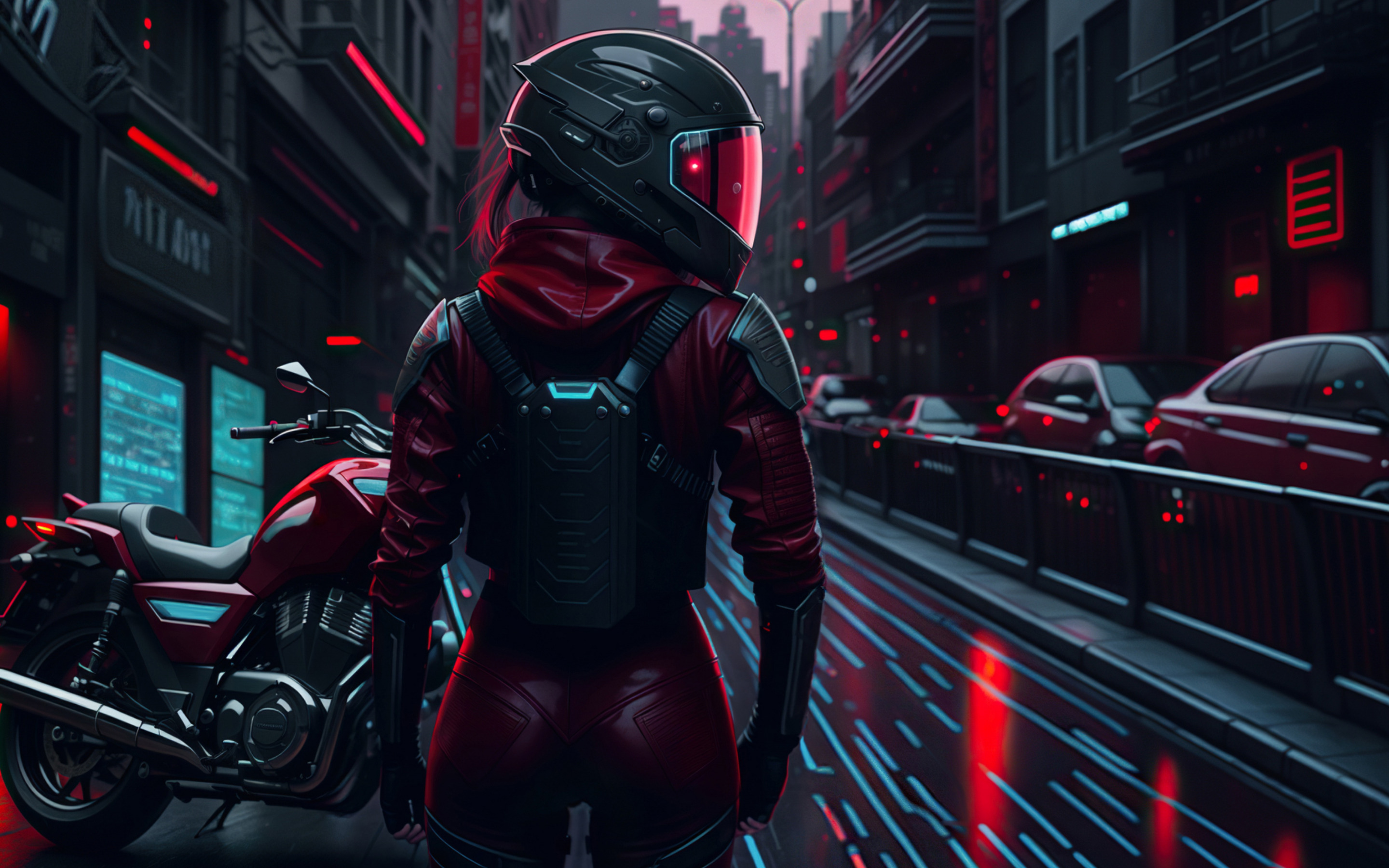 Description: A person in a red outfit and helmet walking down a street with a motorcycle in the background and a red light on the street.