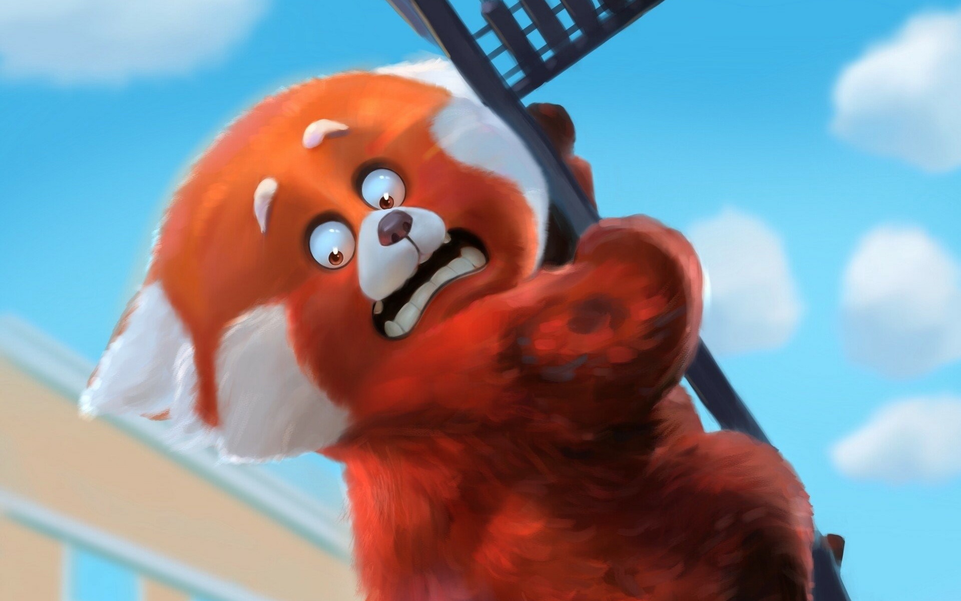 Description: A red panda bear holding a tennis racket in its mouth and looking up at the sky with clouds in the background.
