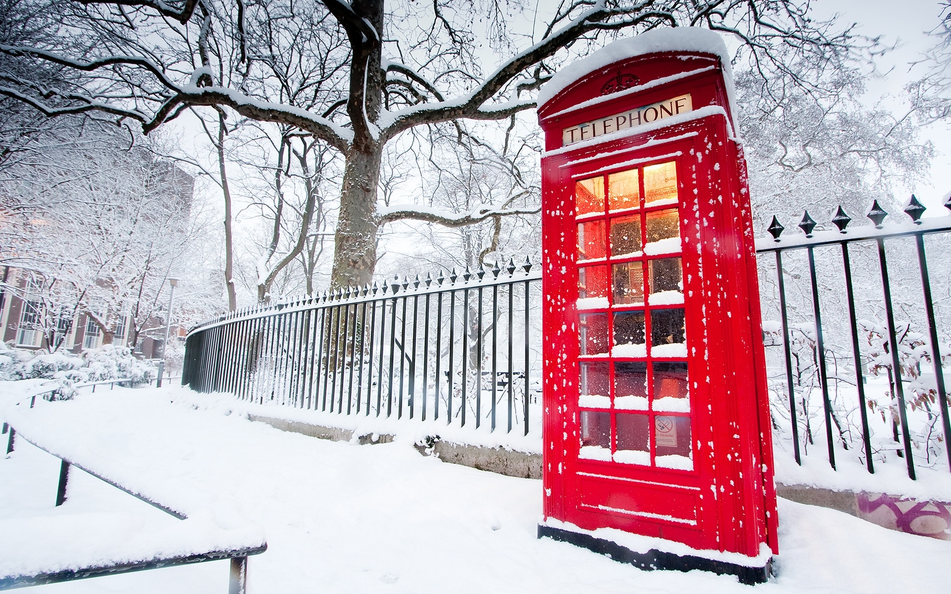 Description: A red phone booth is covered in snow near a fence and tree in the snow.
