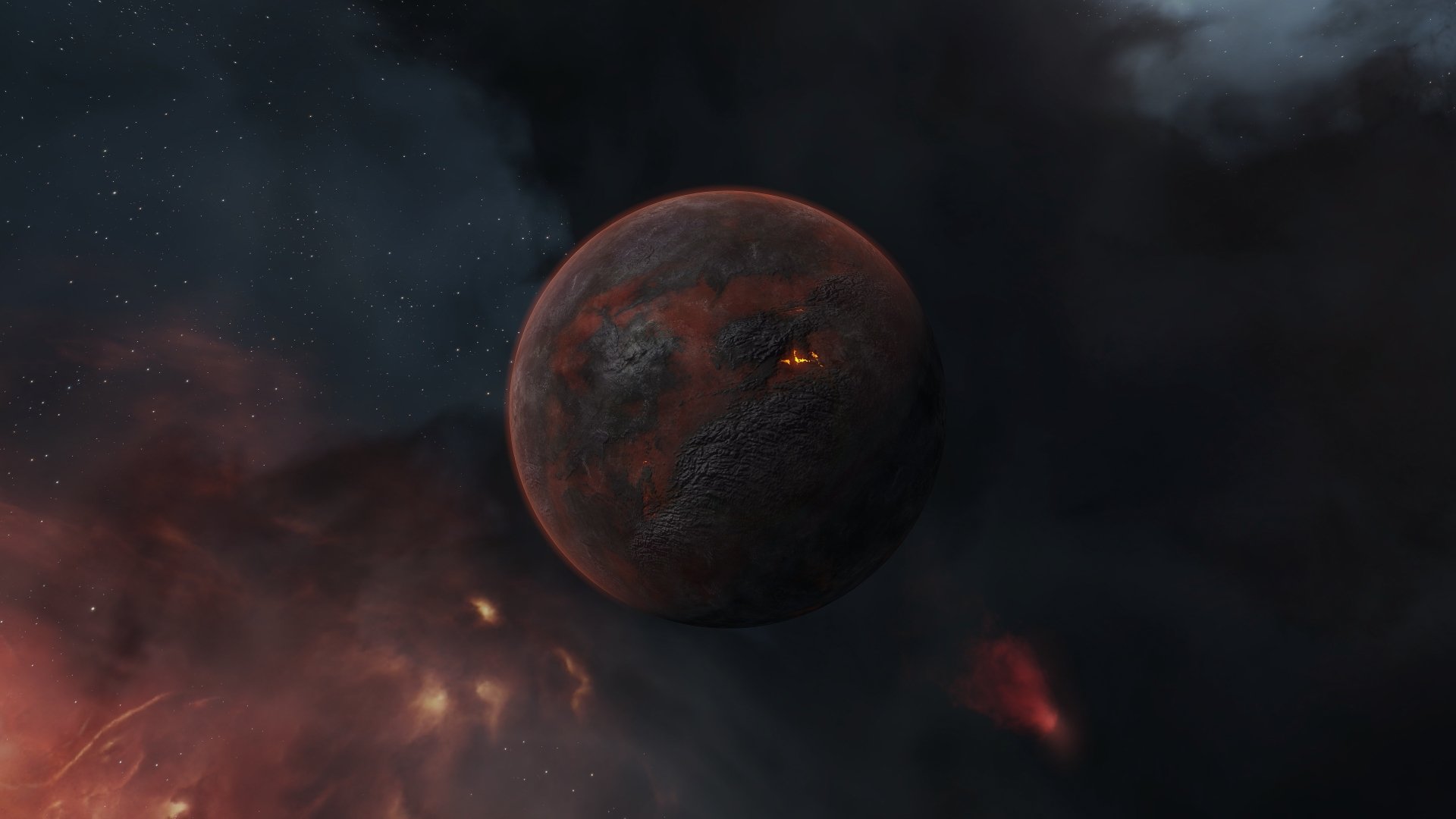 Description: A red planet with a black background and a red light in the center of it's atmosphere is shown.
