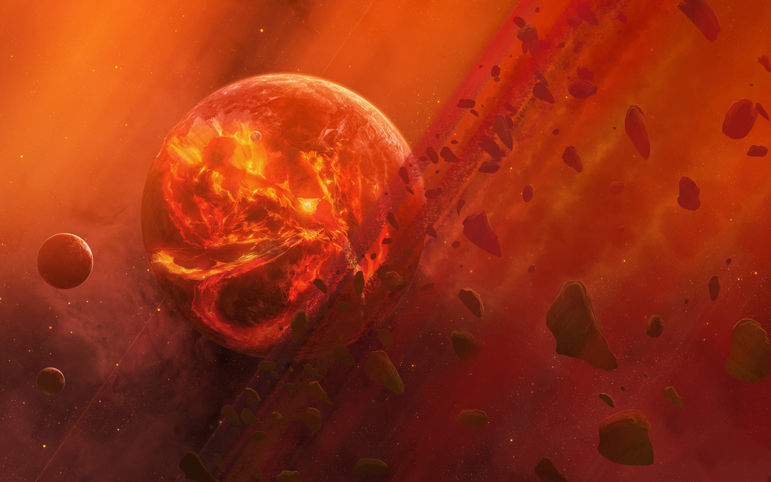 Description: A red planet with a fireball in the middle of it and a lot of lava around it in the background.