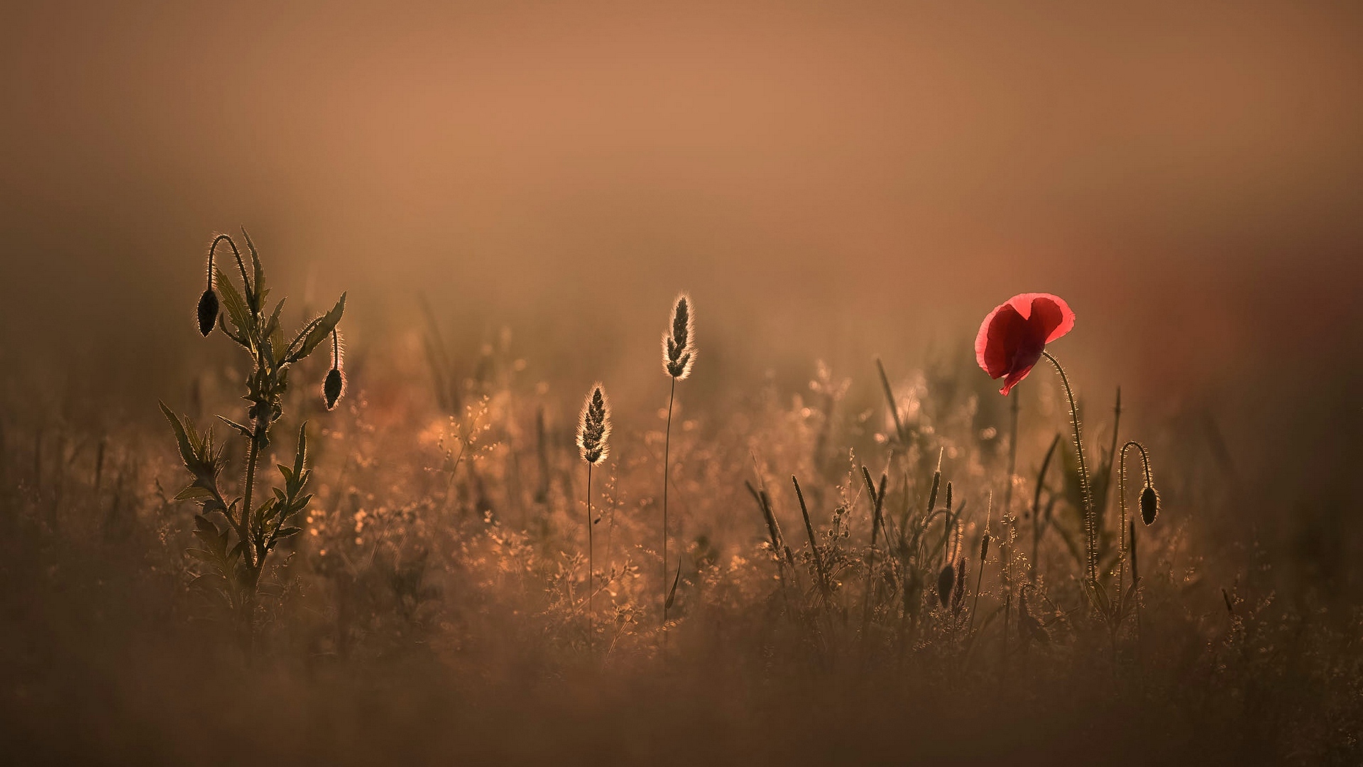 Description: A red poppy in a field of tall grass with a brown background and a brown sky in the background.