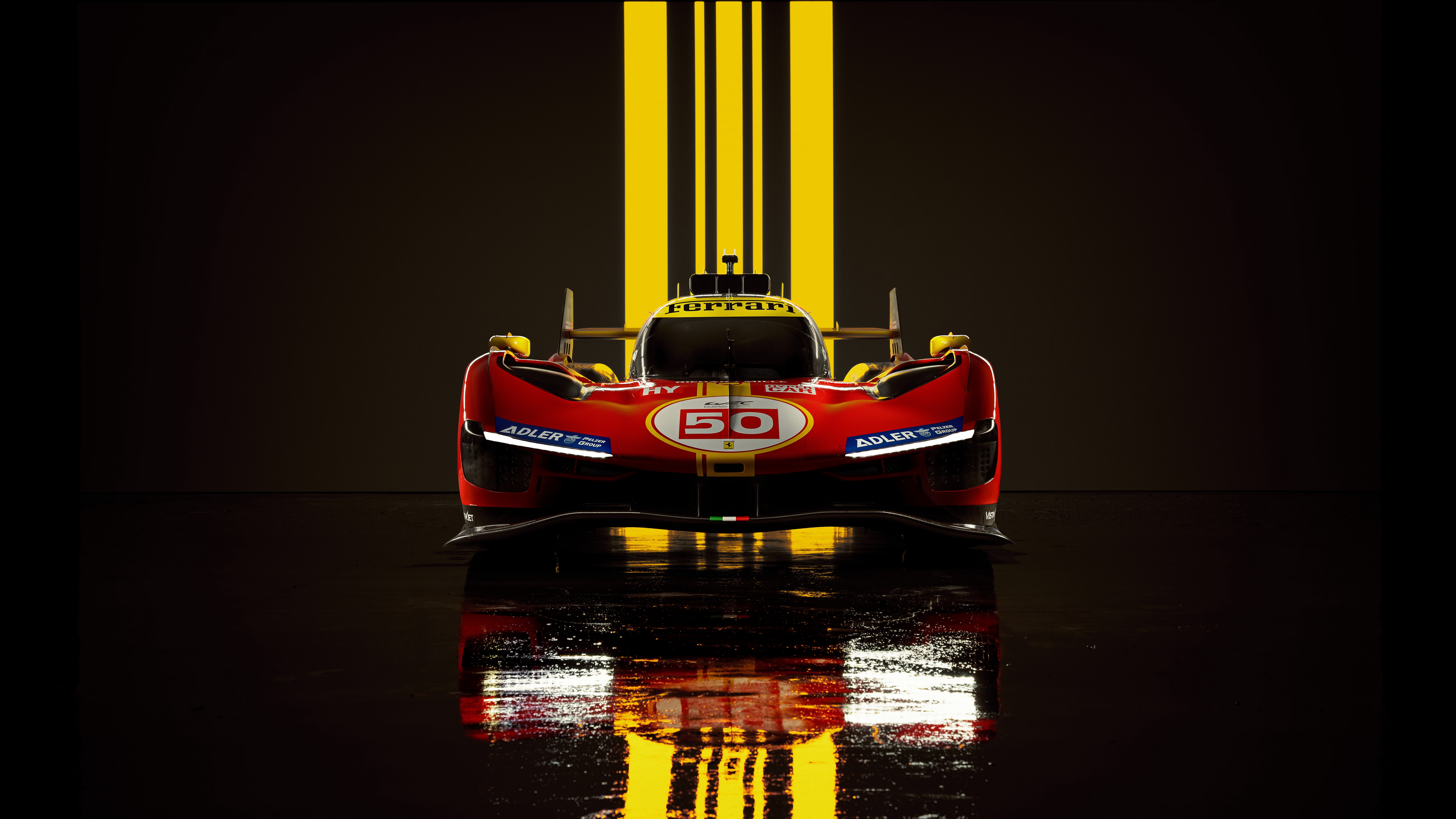 Description: A red race car with a yellow stripe around it's head and a black background with a reflection of the car.