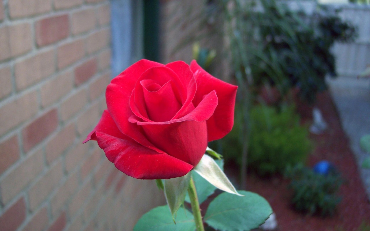 Description: A red rose is blooming in a garden near a brick wall and a brick walkway in the background.