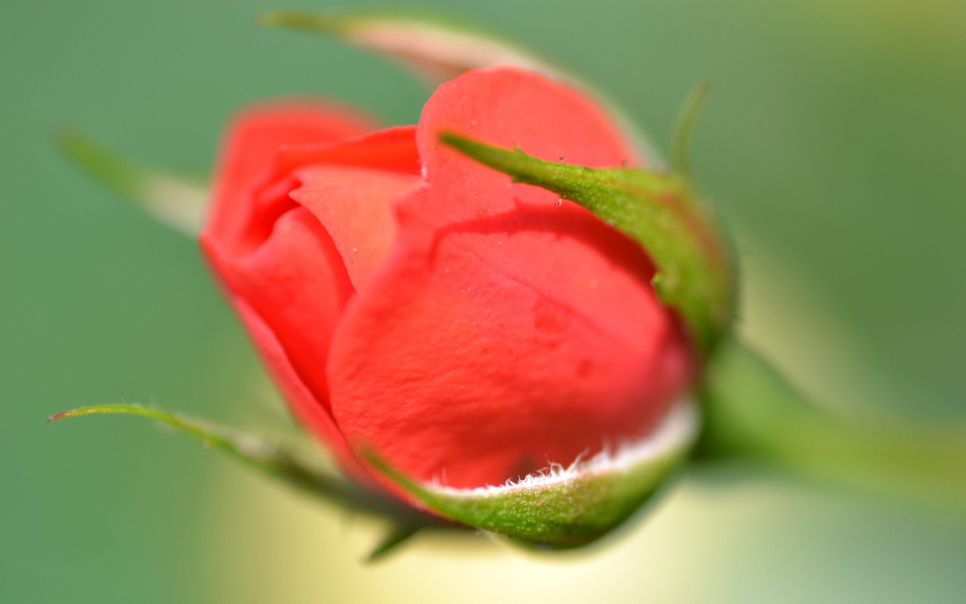 Description: A single red rose bud with a green background and a blurry background behind it.
