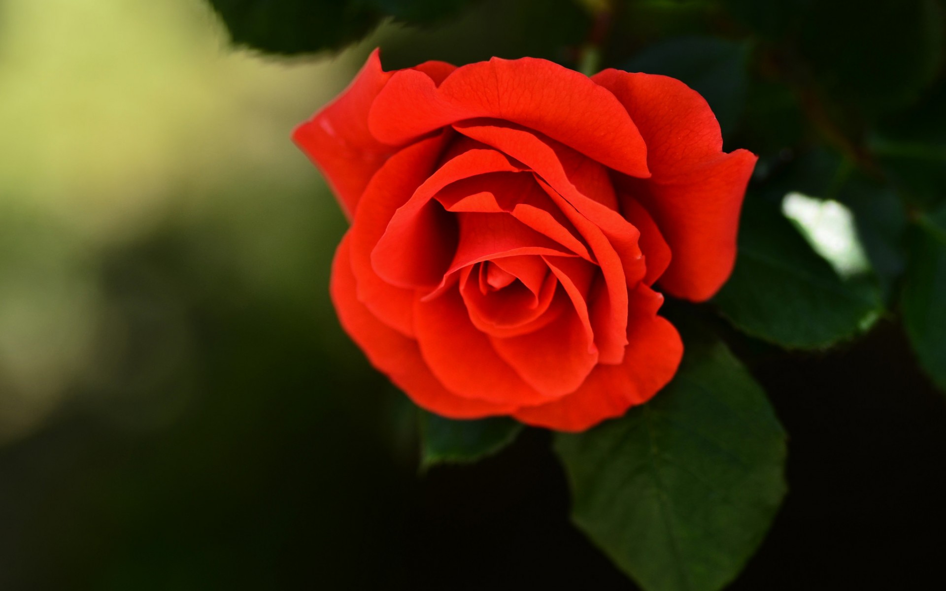 Description: A red rose with green leaves on a tree branch in the sunlight.