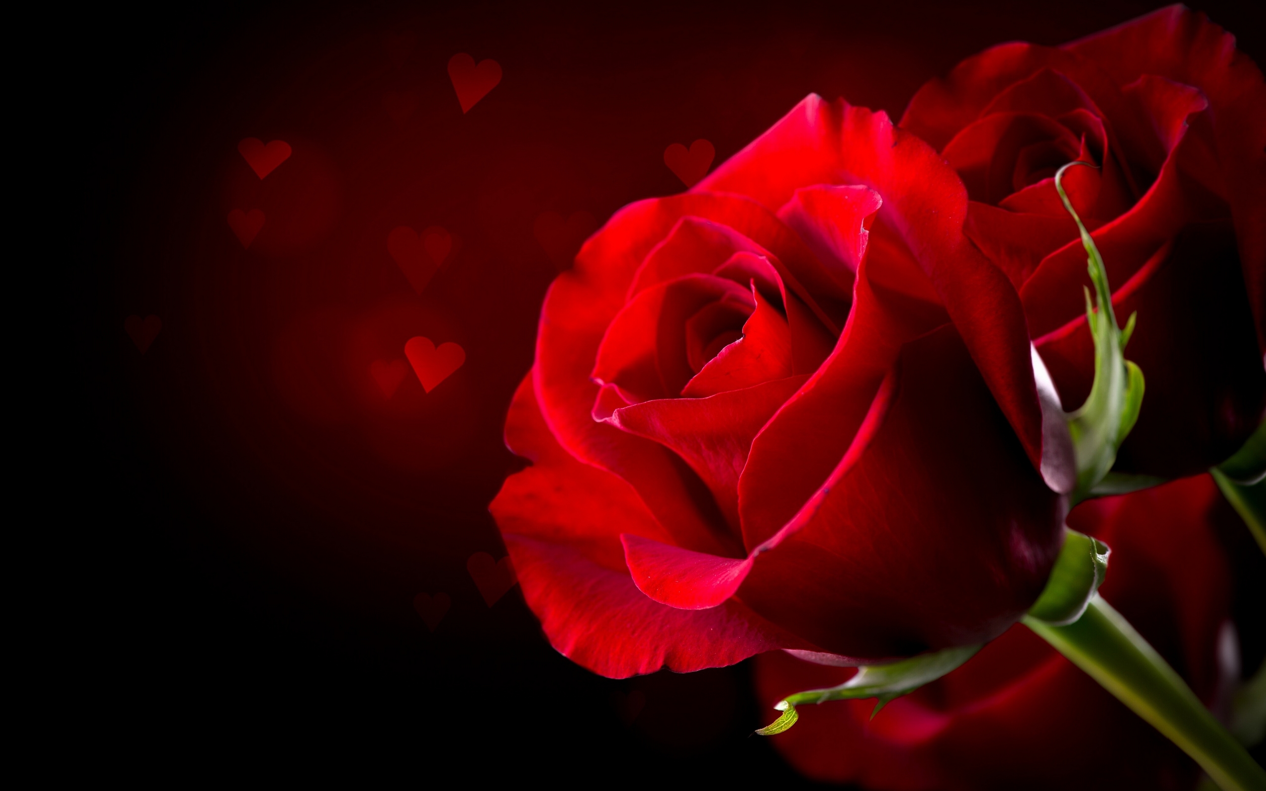 Description: A red rose with hearts on a black background with a red light in the background and a red rose in the foreground.