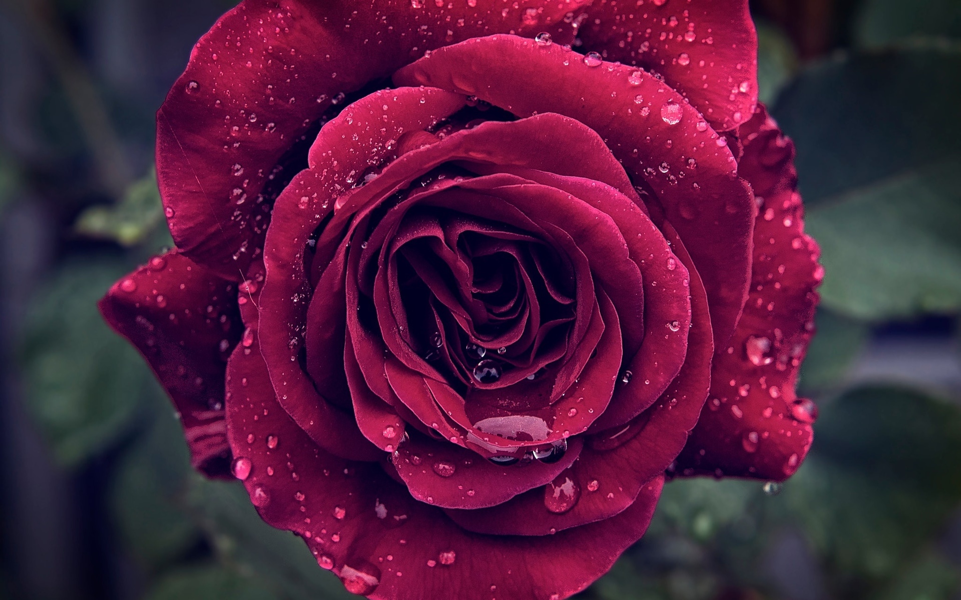 Description: A red rose with water droplets on it's petals and leaves in the background.