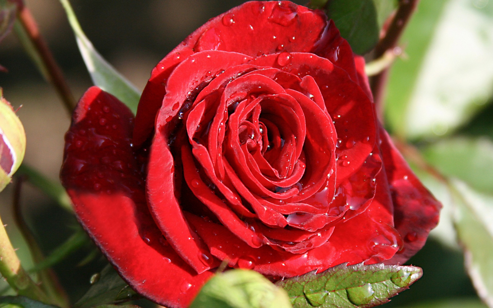 Description: A red rose with water droplets on it's petals and leaves in the background.