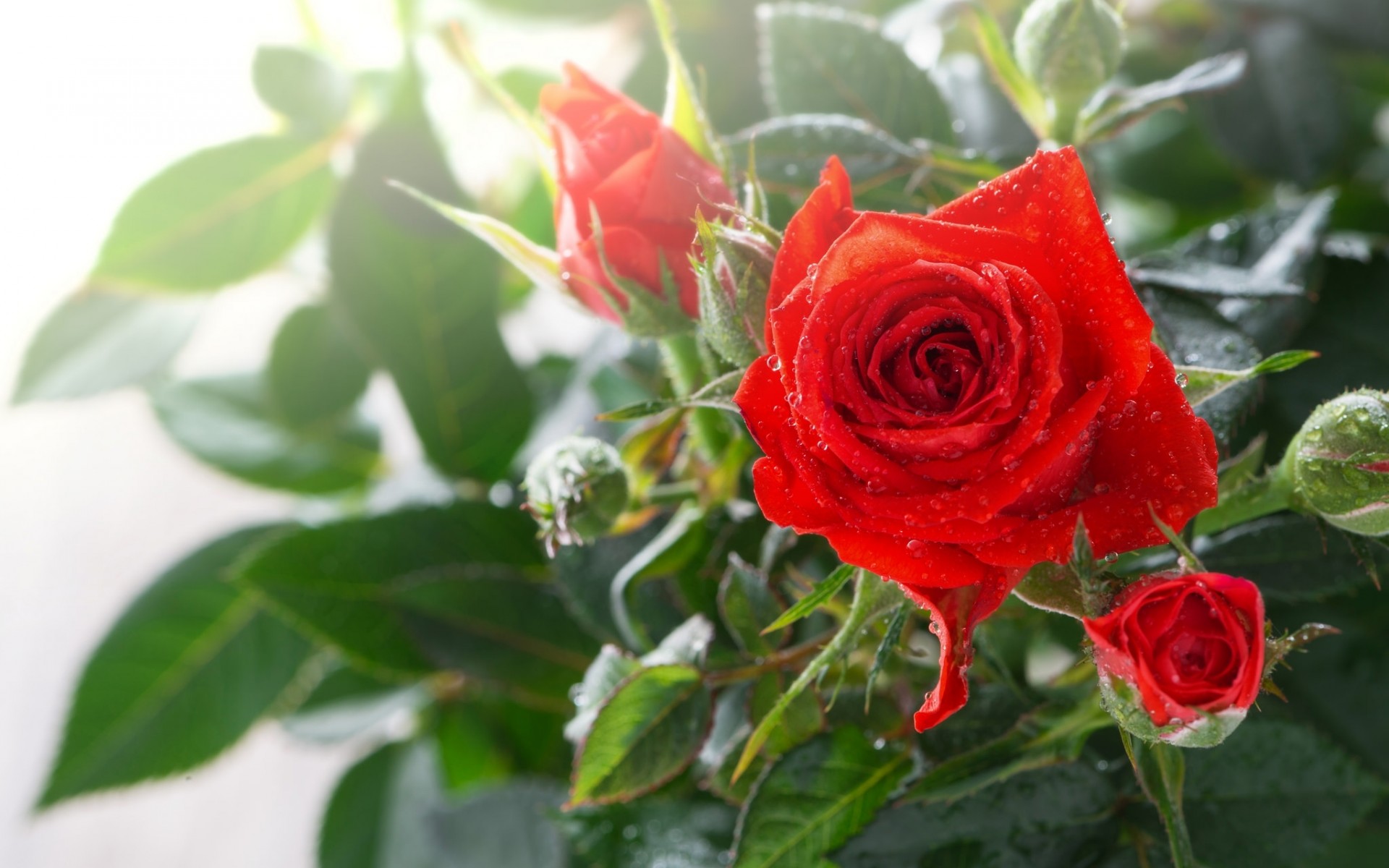 Description: A close up of a red rose with water droplets on it's petals and leaves.
