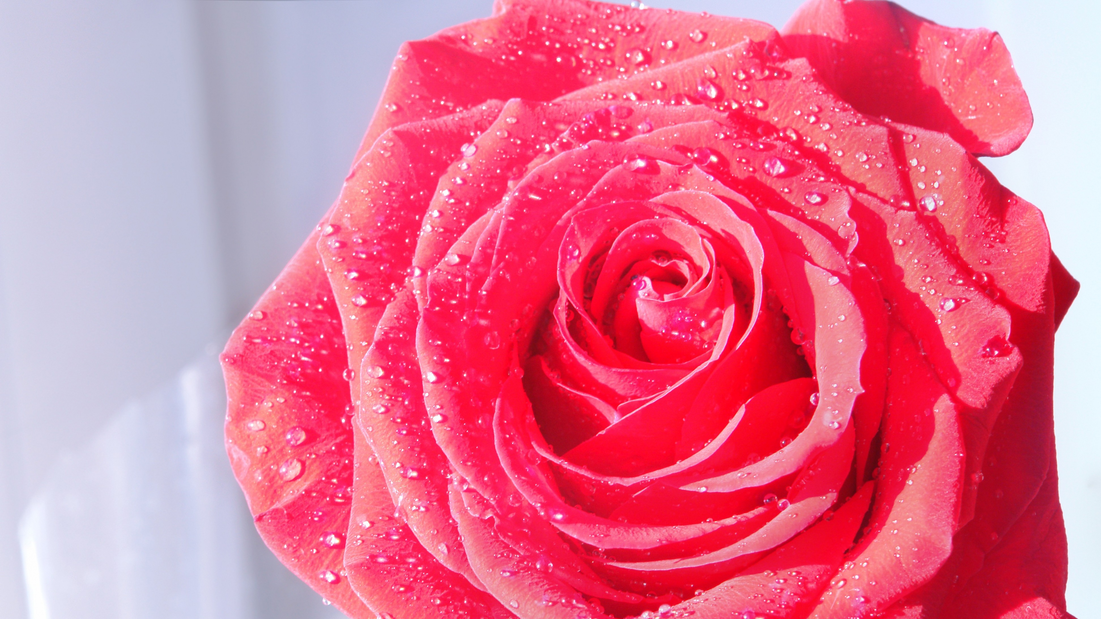 Description: A red rose with water droplets on it's petals and a white background with a door in the background.