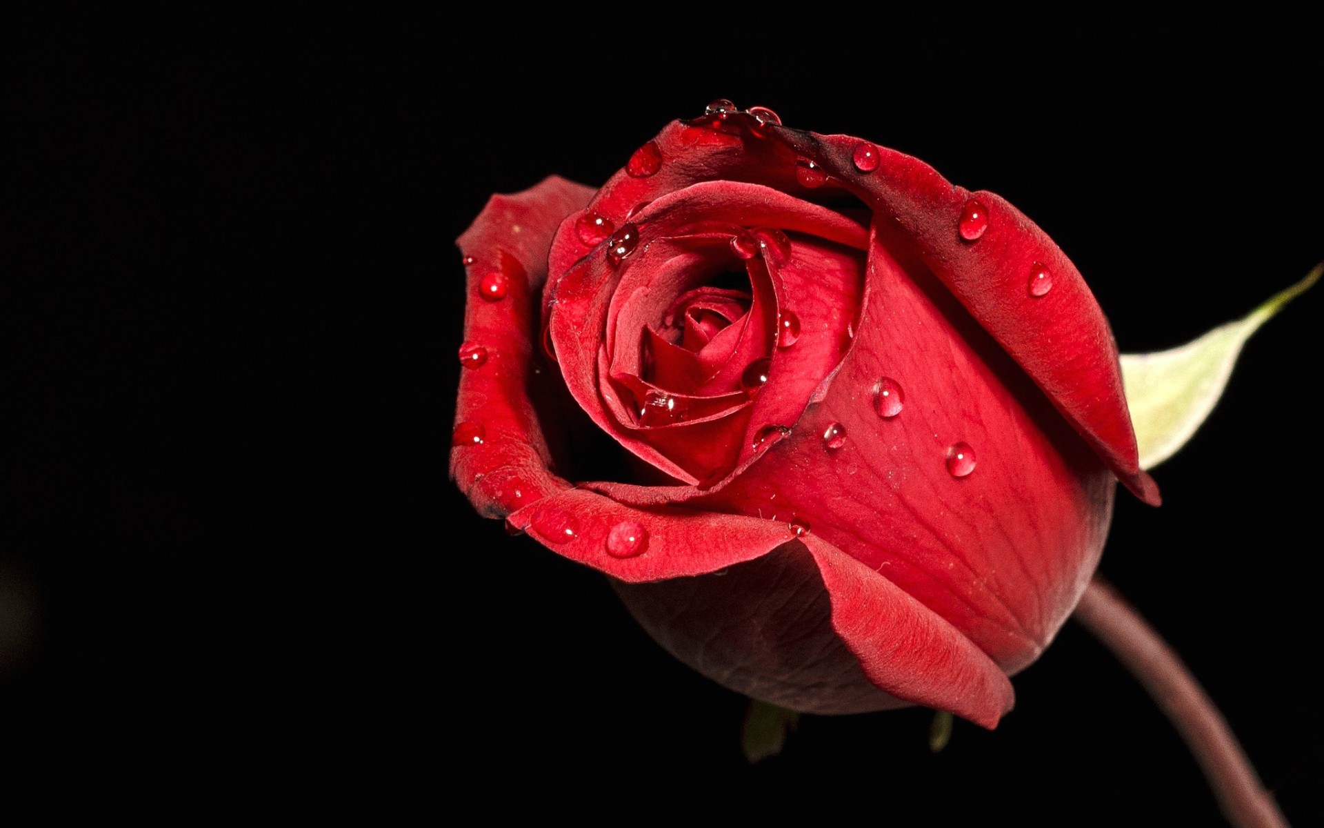 Description: A red rose with water droplets on it's petals and a black background with a drop of water on it.