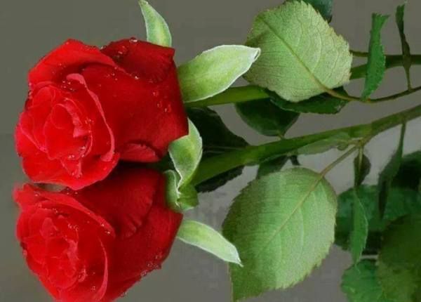 Description: A red rose with water droplets on it's petals and leaves.