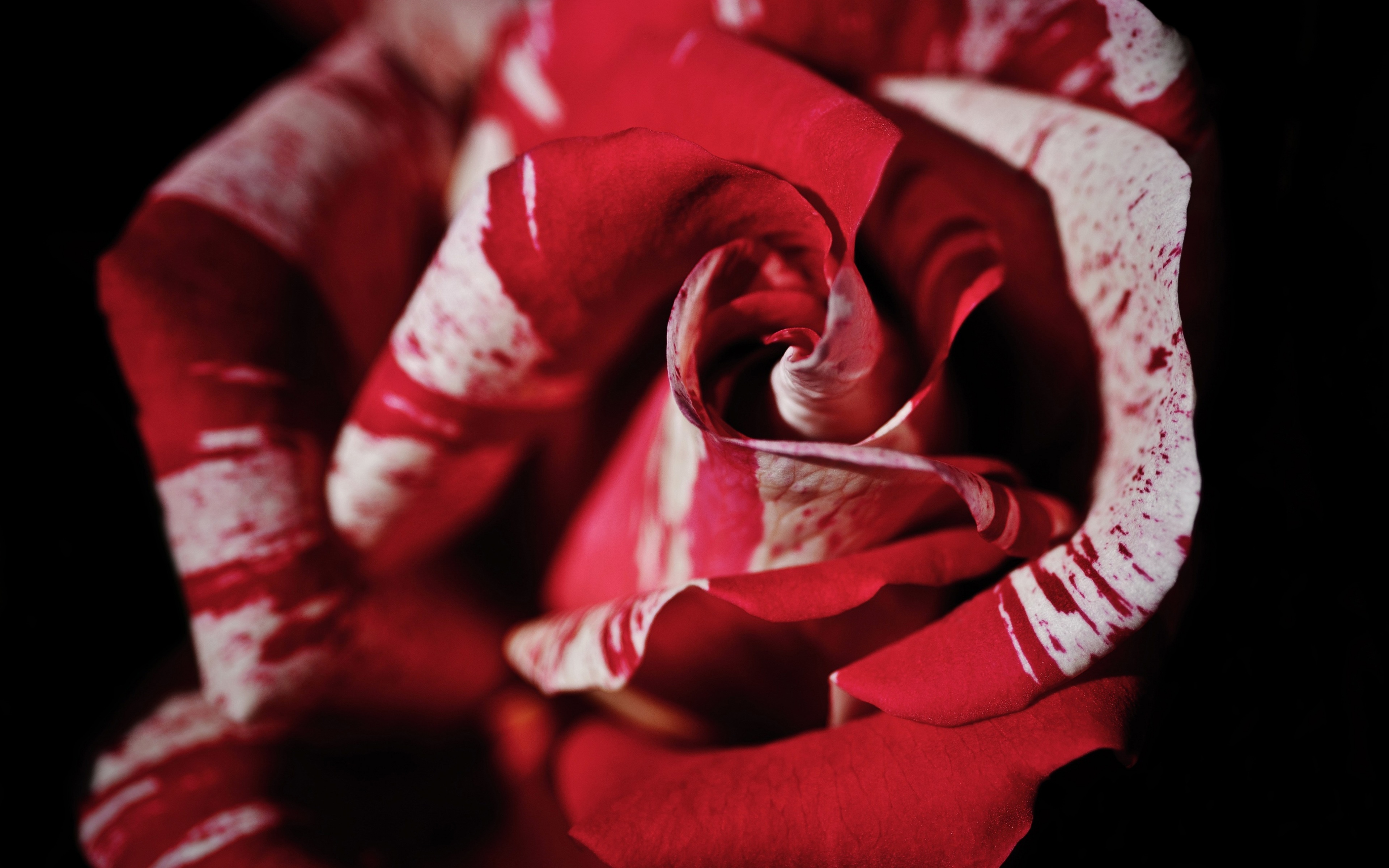 Description: A red rose with white stripes on it's petals and petals are in the dark.