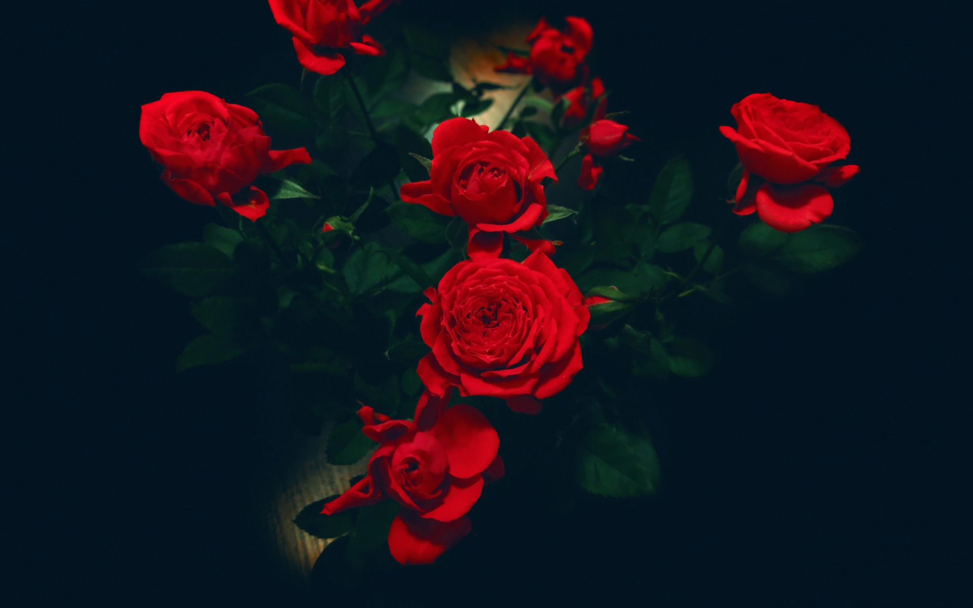 Description: A bouquet of red roses on a black background with a dark background and a white border with a black border.