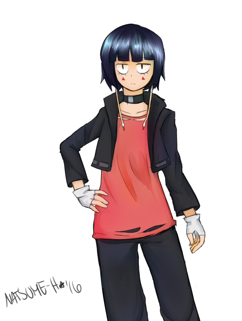 Description: A person with a red shirt and black pants and a black jacket and a red shirt and a black jacket.