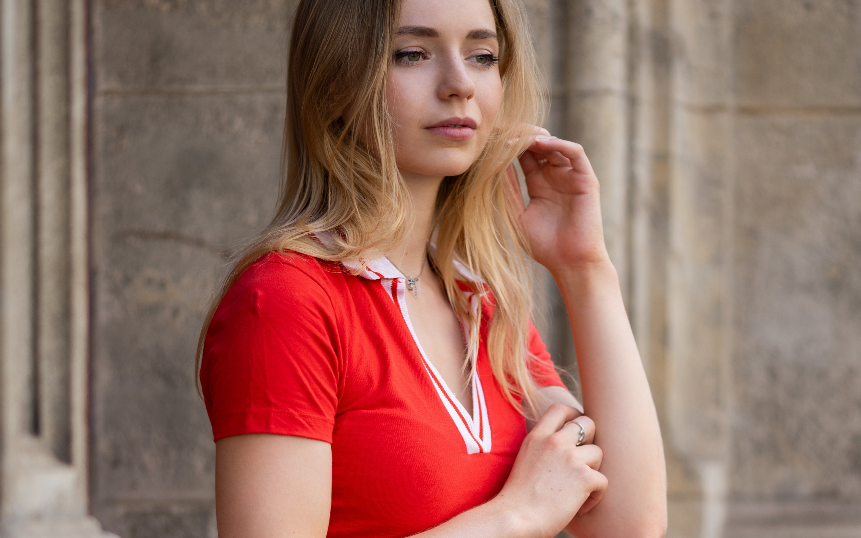 Description: A woman in a red shirt is posing for a picture with her hand on her shoulder and her hand on her chin.