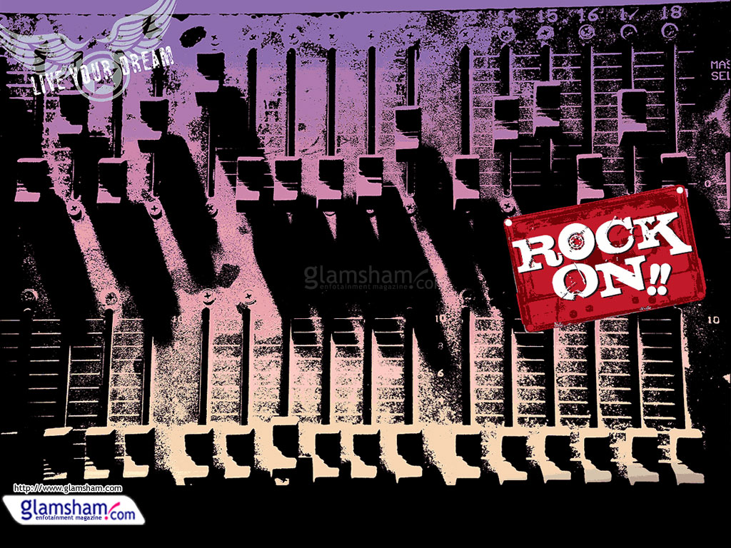 Description: A red sign that reads rock on on a black background with a purple background and a red brick wall.