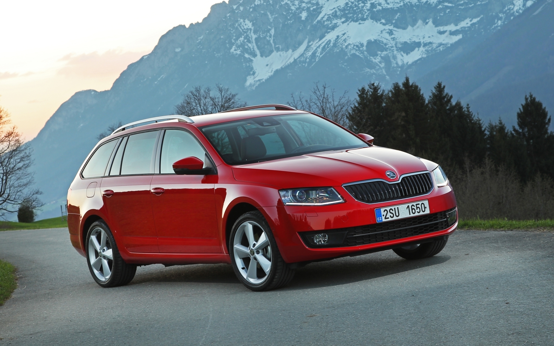Description: A red skunk parked on a road in front of a mountain range at sunset with a red sky.