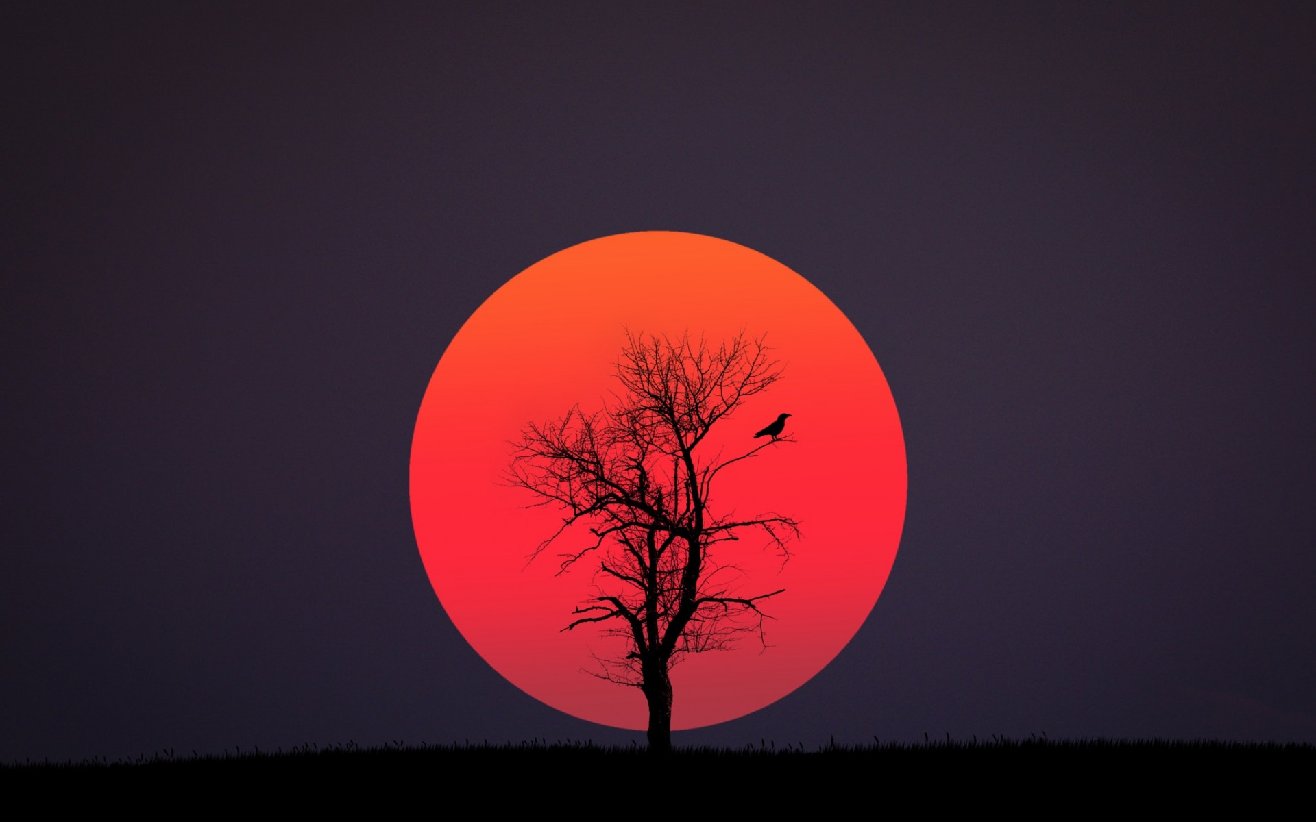 Description: A tree with a bird flying in front of a red sun in the sky with a bird flying in the distance.