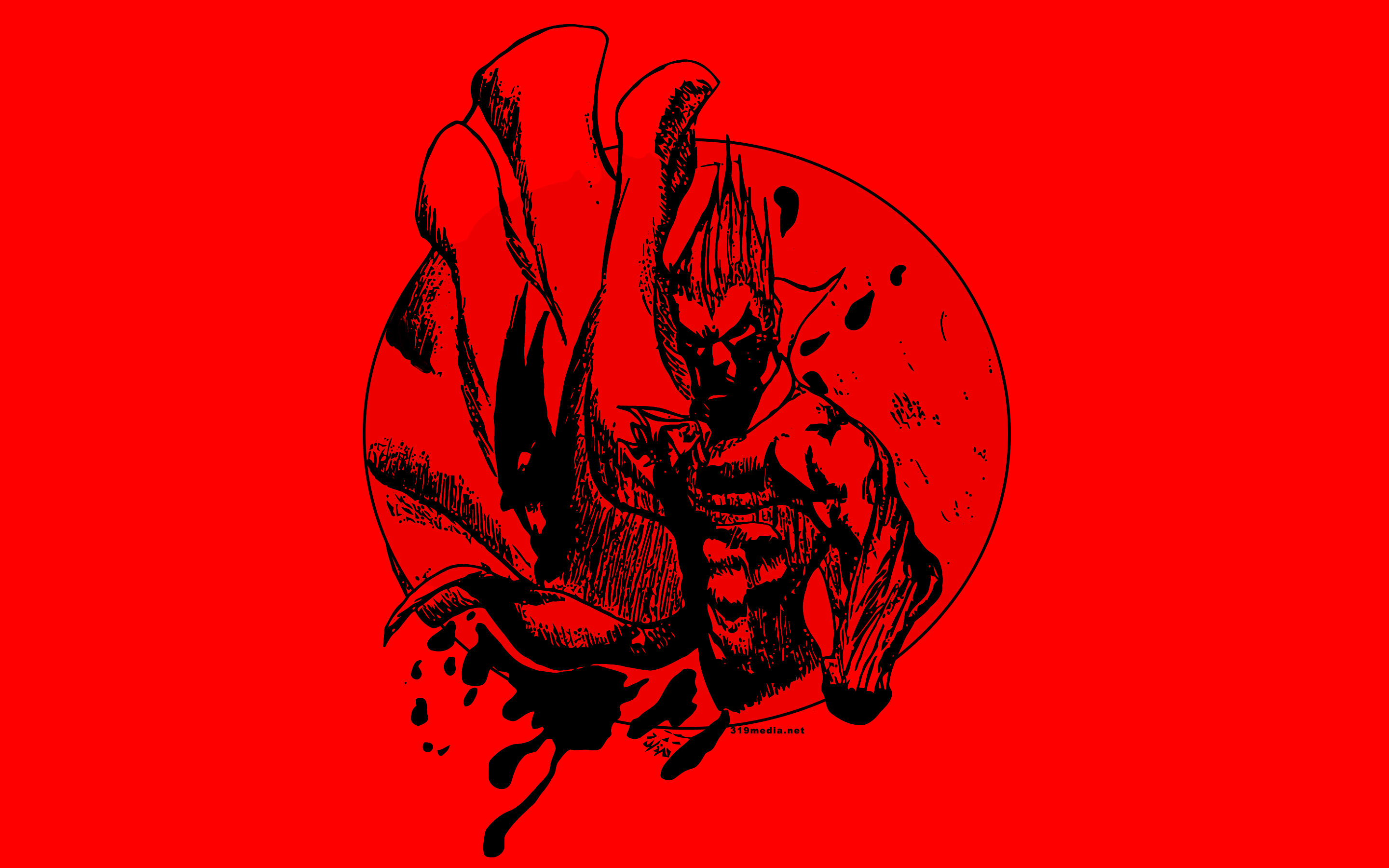 Description: A red background with a black and white drawing of a woman with a knife in her hand and a red circle.